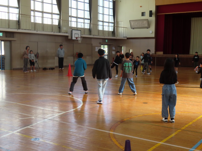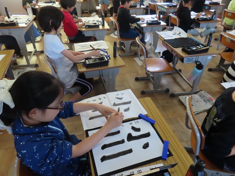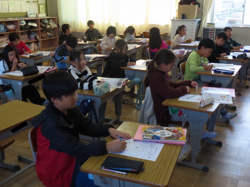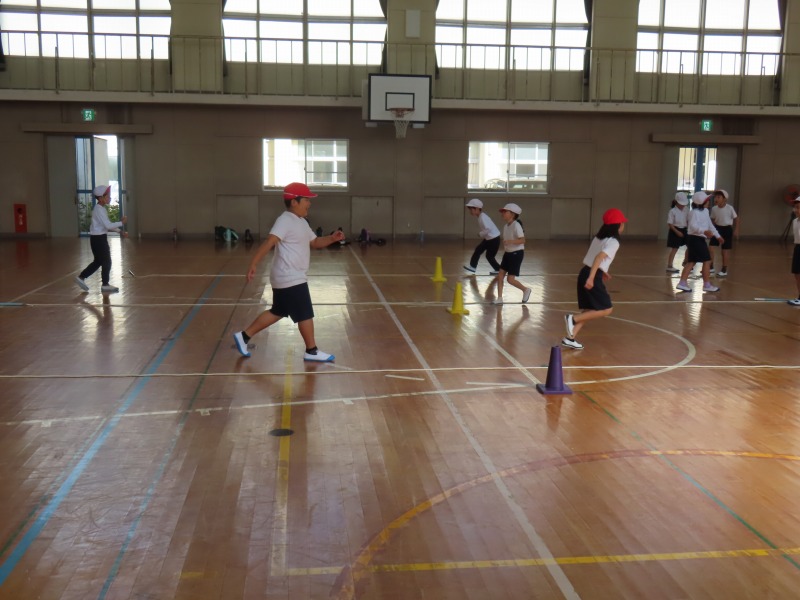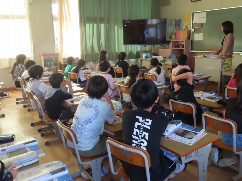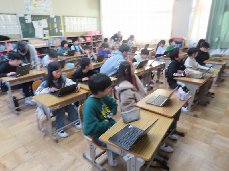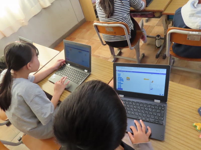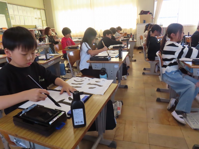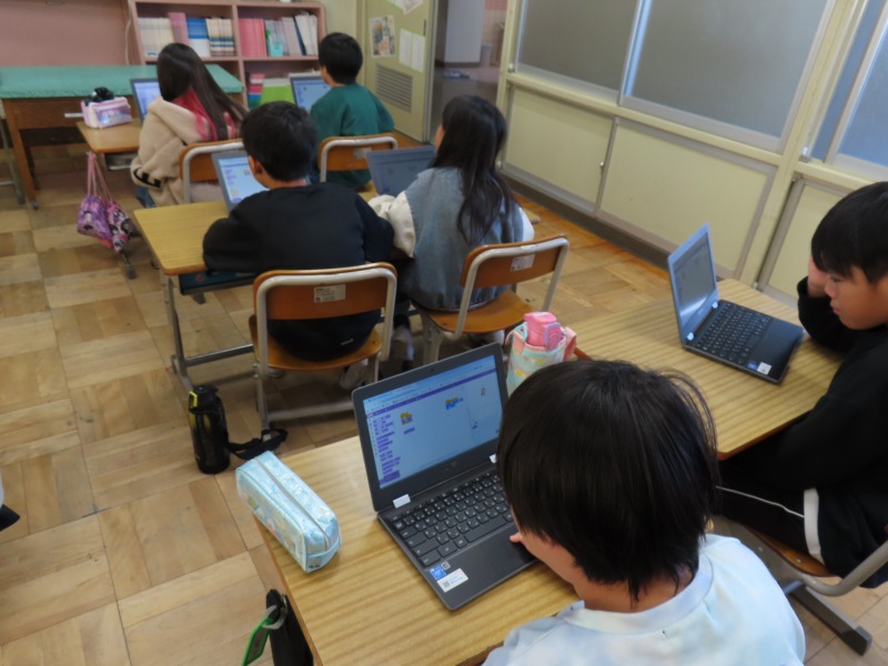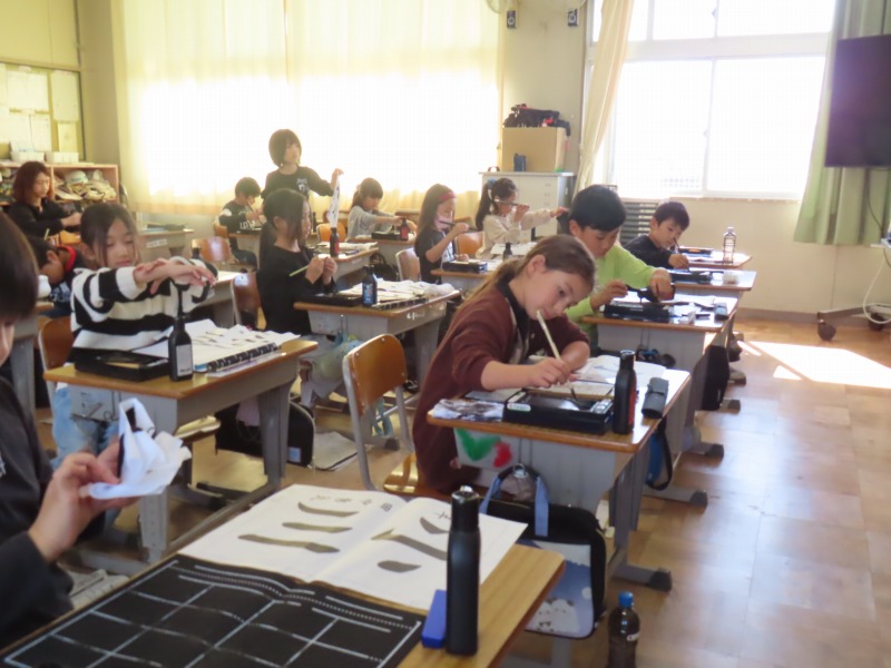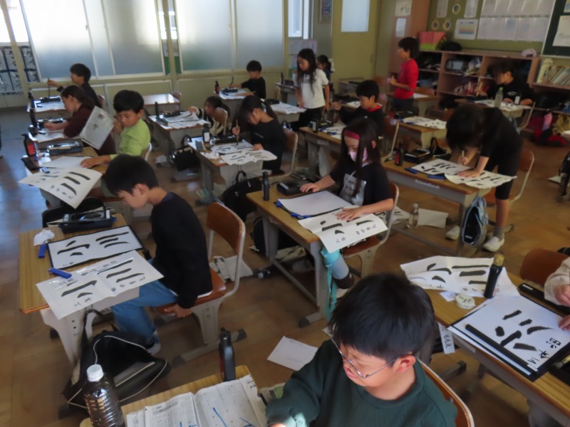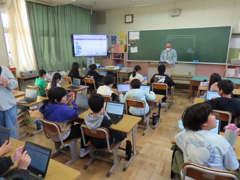 今日の授業の様子です。4年生は情報教育アドバイザーの先生の指導でプログラミングを学びました。キャラクターを動かしたり、音を出したり楽しみながらプログラミング学んでいます。3年生は書写で「小川」をかきました。1年生は体育でグループに分かれ障害物をつかったゲームを考えていました。