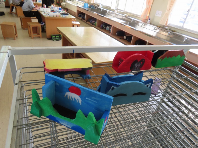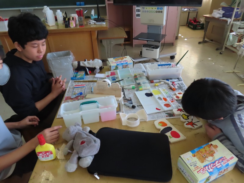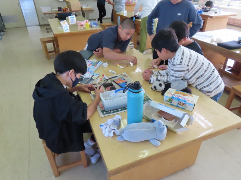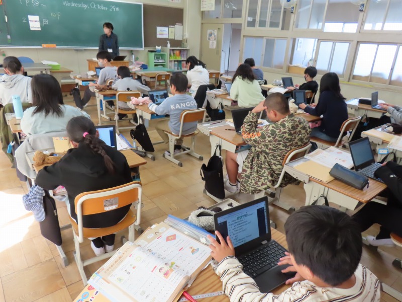 6年生の図工と外国語活動の様子です。図工ではテープカッターを作っていました。もう完成している子もいました。外国語活動では、英語での原稿作りです。全員の原稿がモニターに映っており、進捗状況が一目瞭然全です。