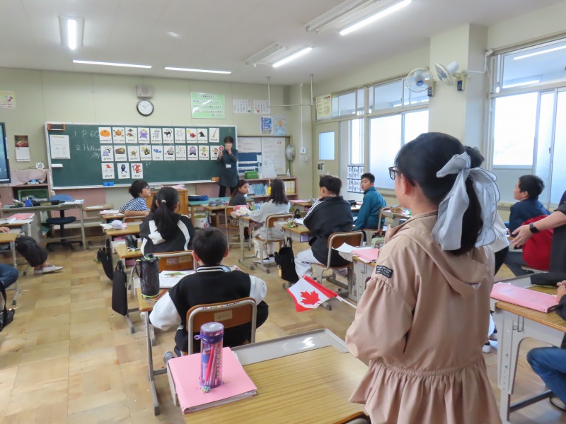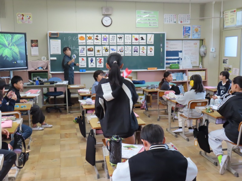 5年生の外国語活動です。今日はハロウィンのキャラクターの名称を覚えます。なかなか難しい単語もしっかり覚え発表できていました。