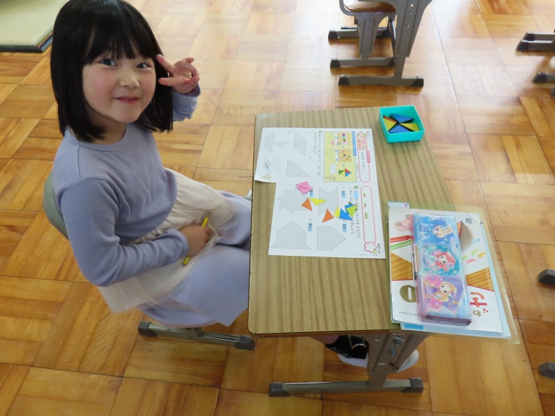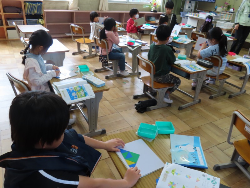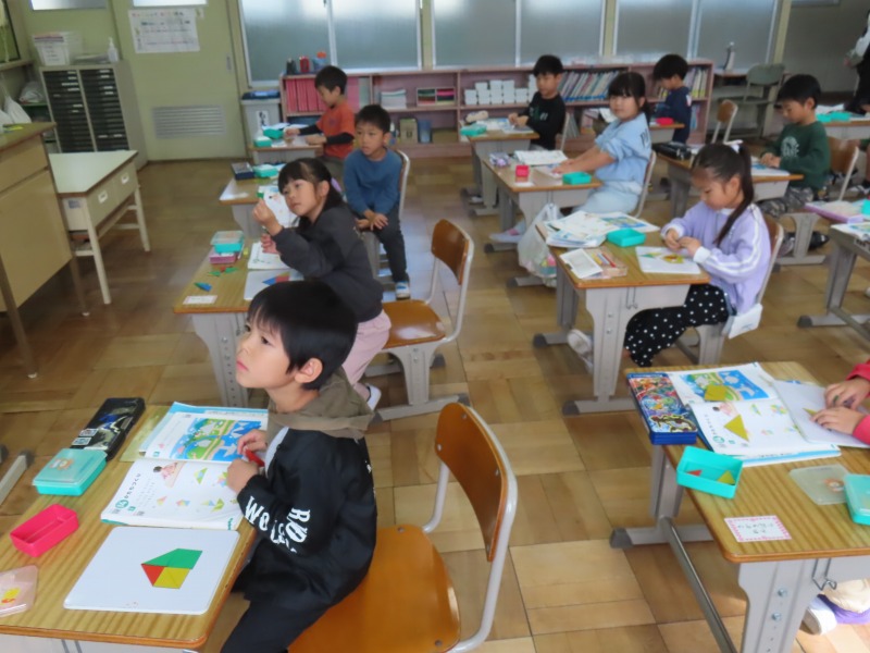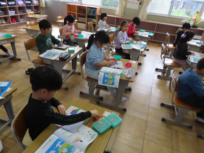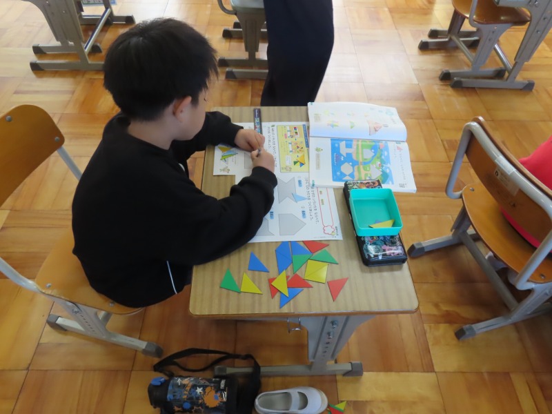 1年生の算数では図形に入りました。△や▢を使って様々な形を作ります。みんな要領よく形を作っていました。楽しそうに取り組んでいました。