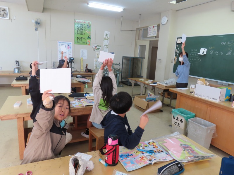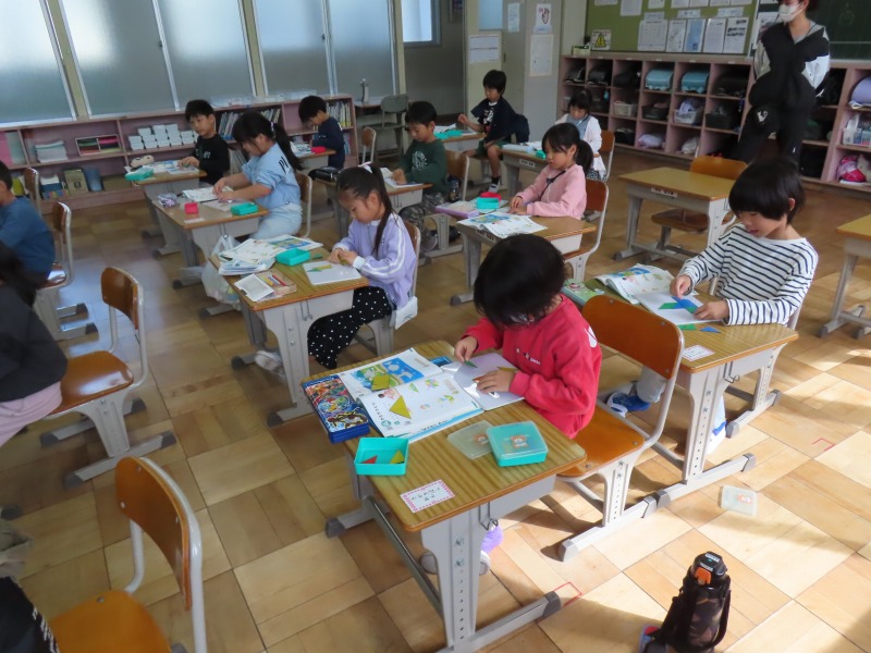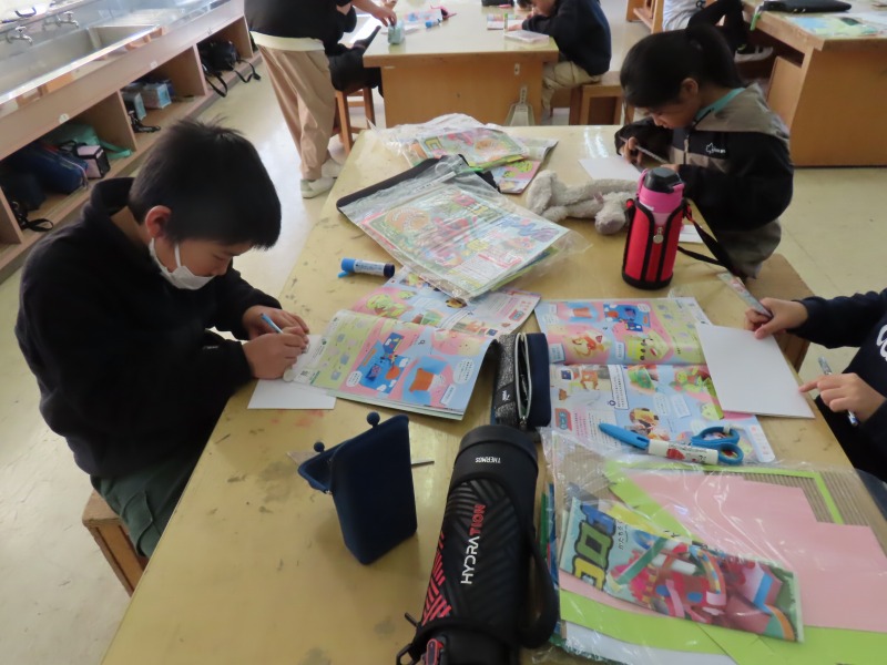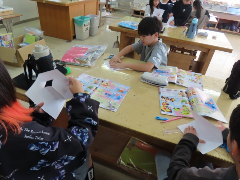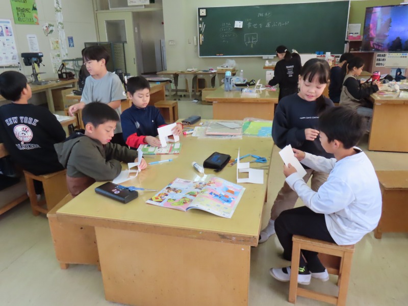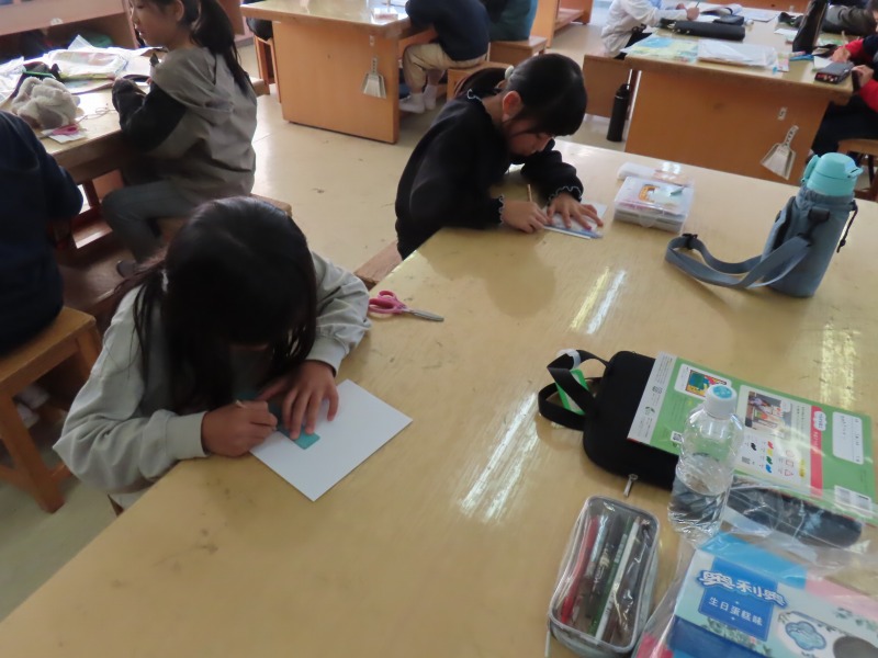 4年生の図工の様子です。今日からメッセージカードを作ります。ケント紙を二つ折り、切り込みをいれ、メッセージカードを開いたときに立体的にメッセージや図柄が起き上がる仕組みです。