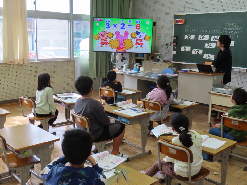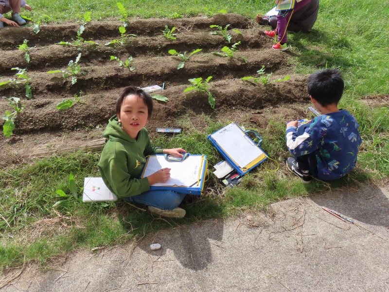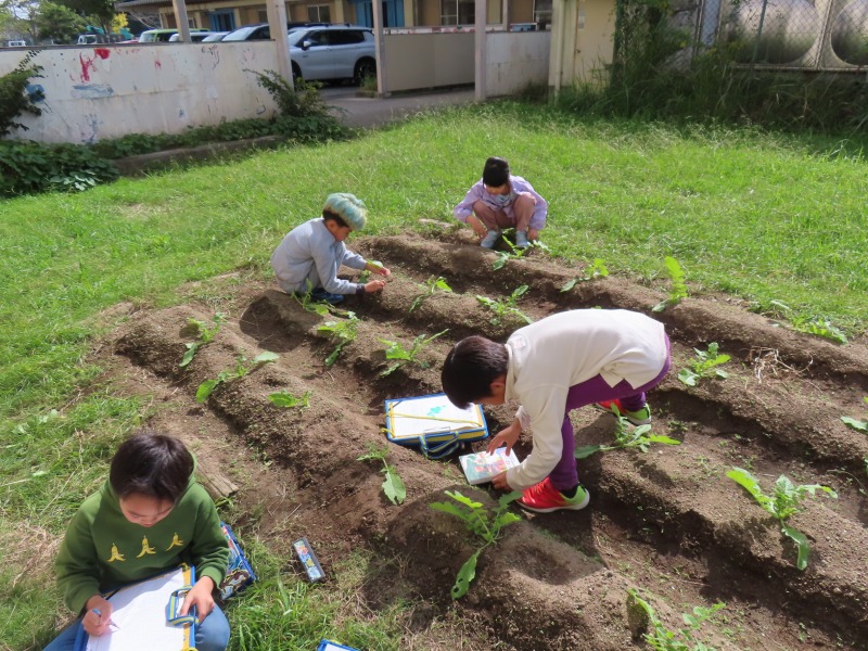 2年生は動画を見て、九九の確認をしています。そろそろ全部言えるようになったかな。また、生活の授業では、畑で大根の観察と雑草抜きをしていました。