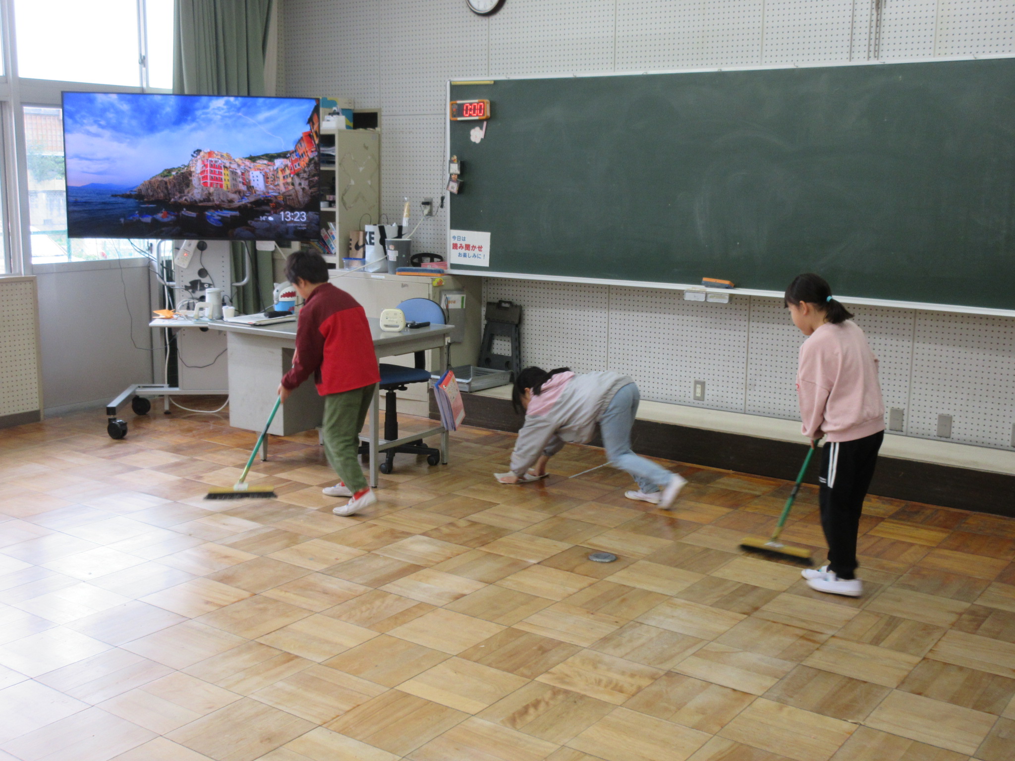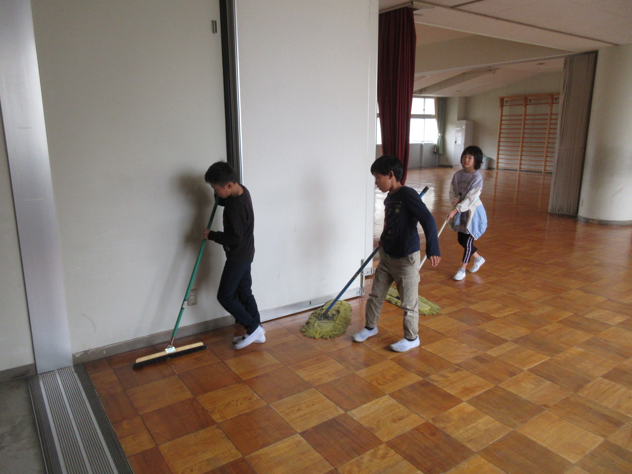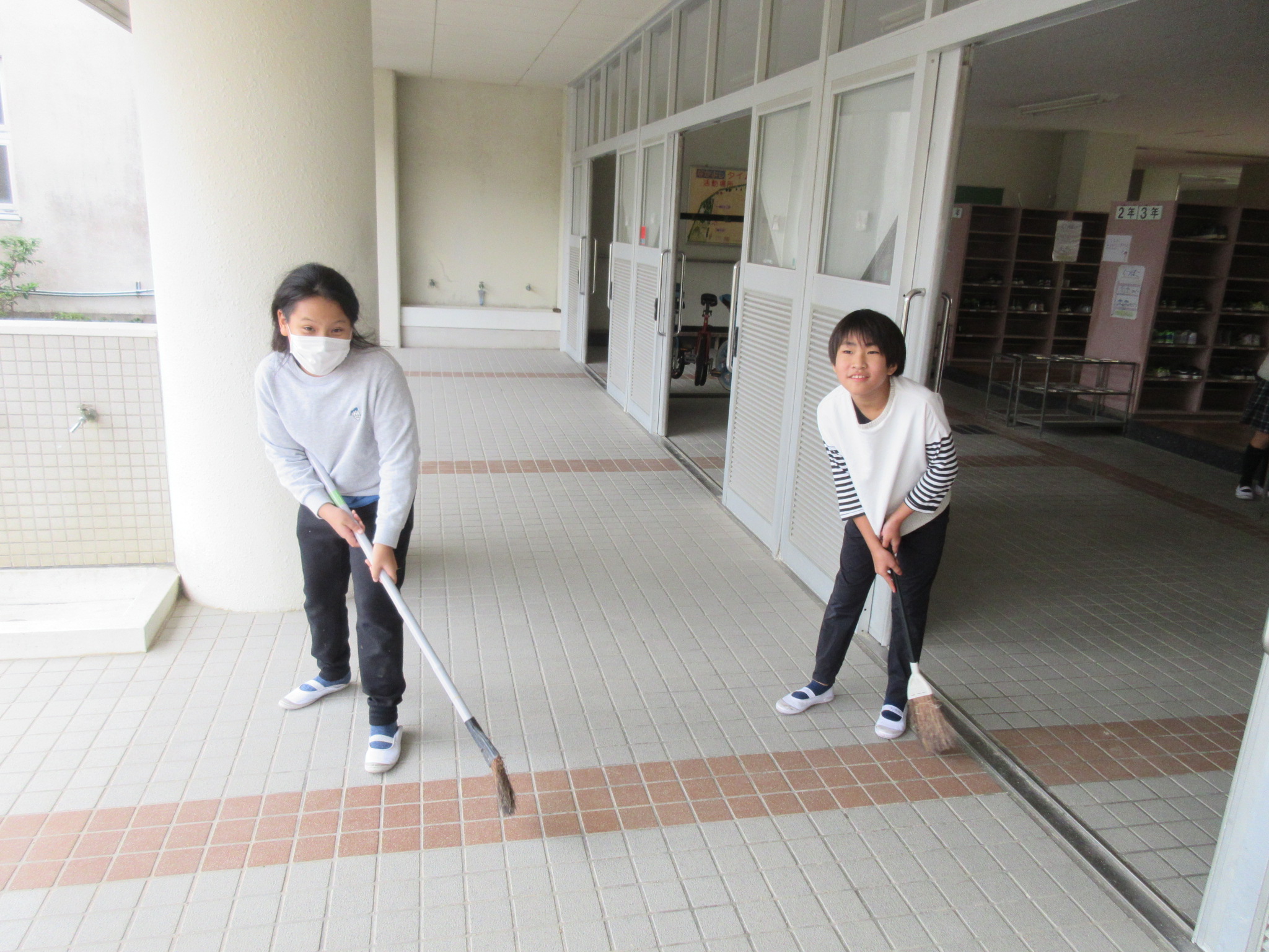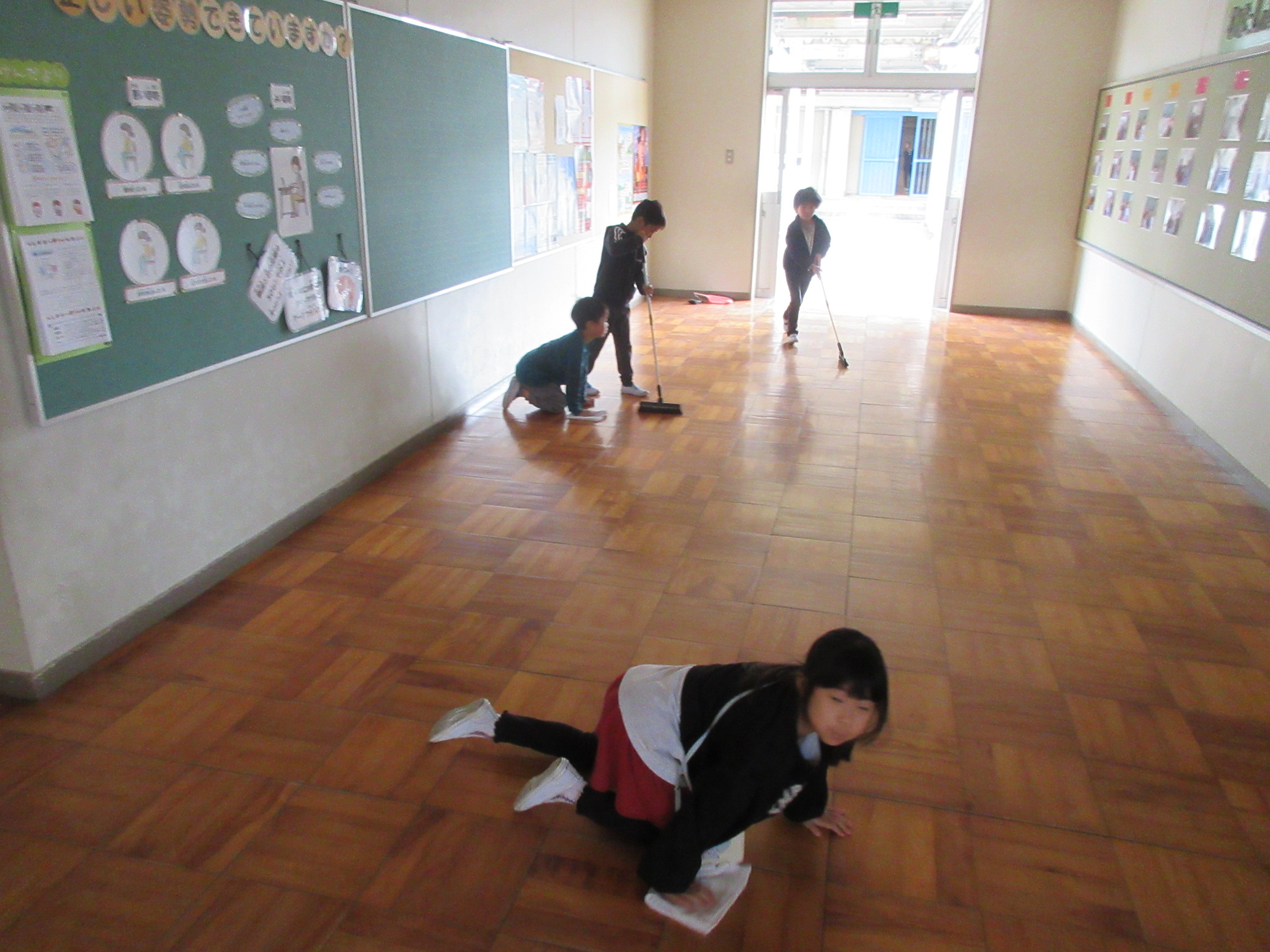 奥田小学校の掃除の時間は、「今から掃除を始めます」の挨拶で始まります。子どもたちは担当の掃除場所に分かれて、協力しながら清掃活動を行います。