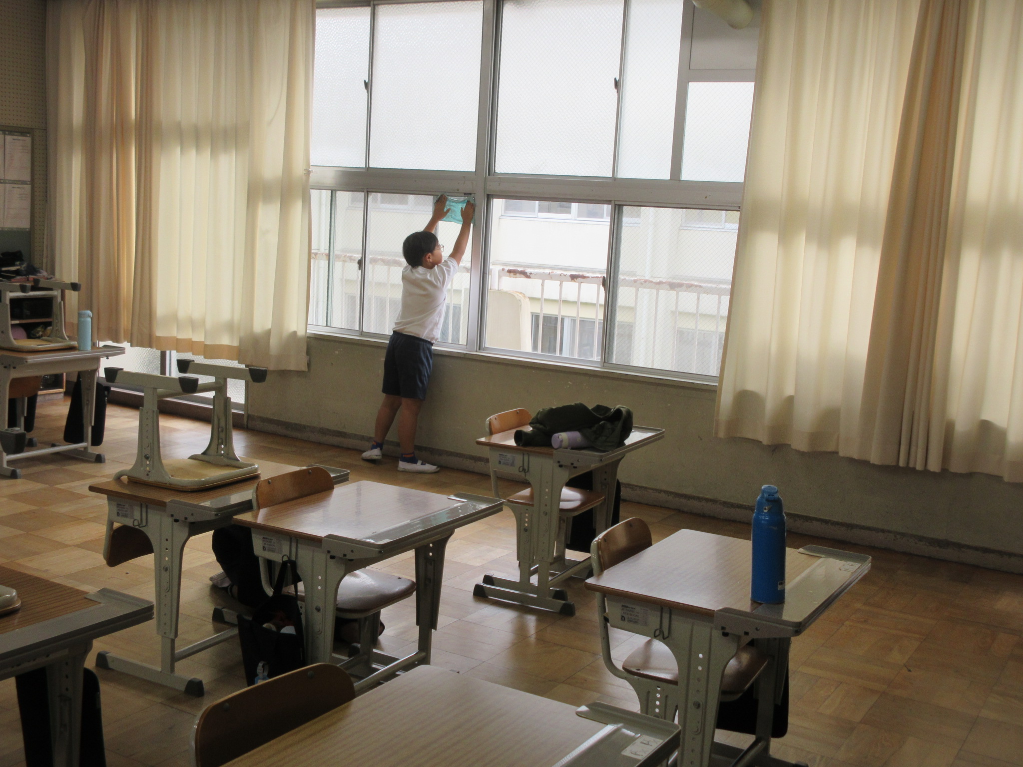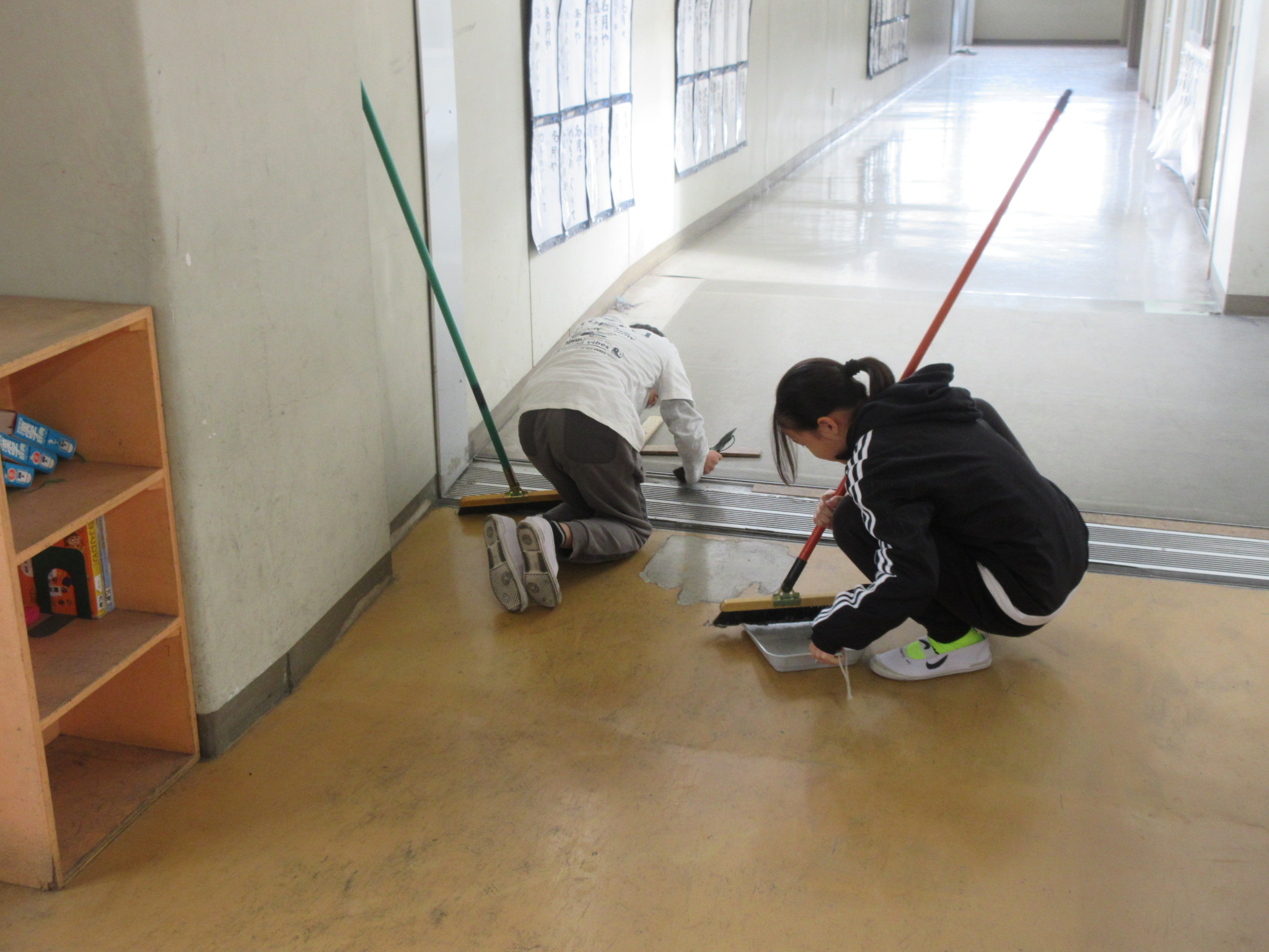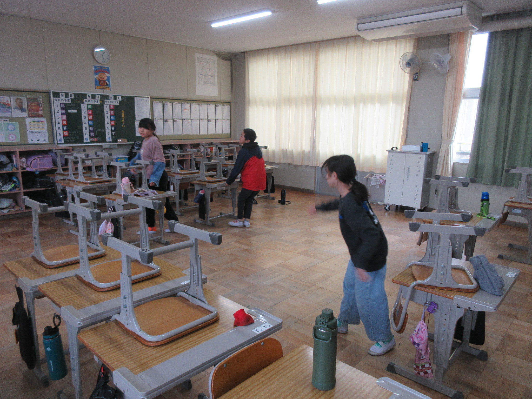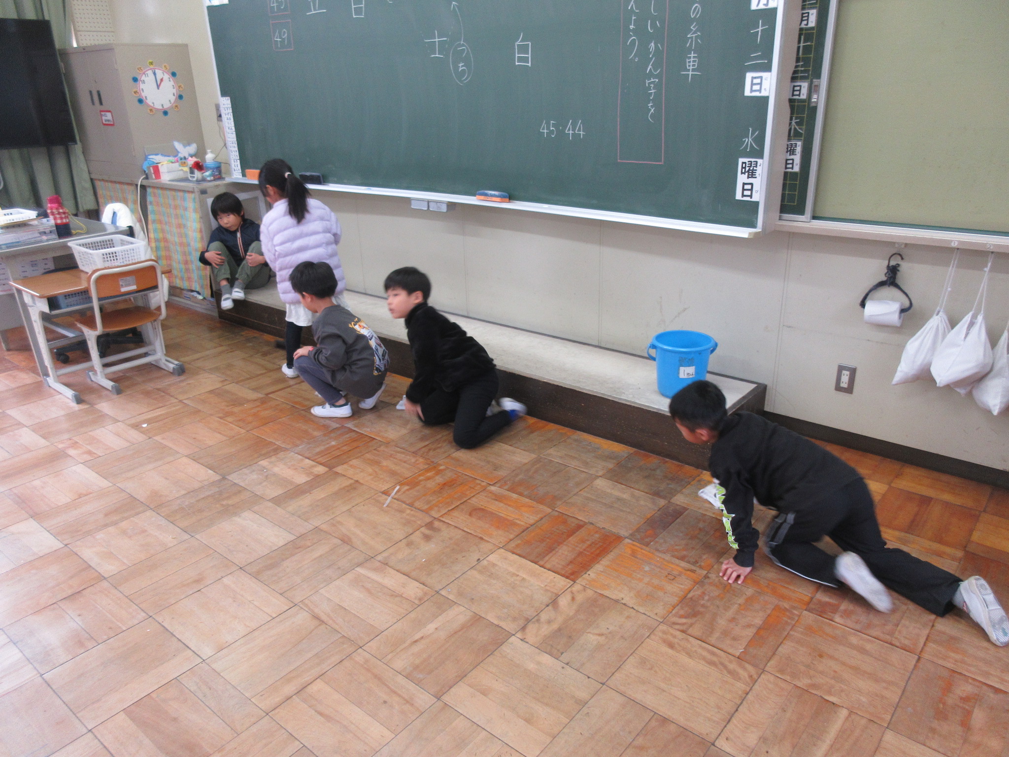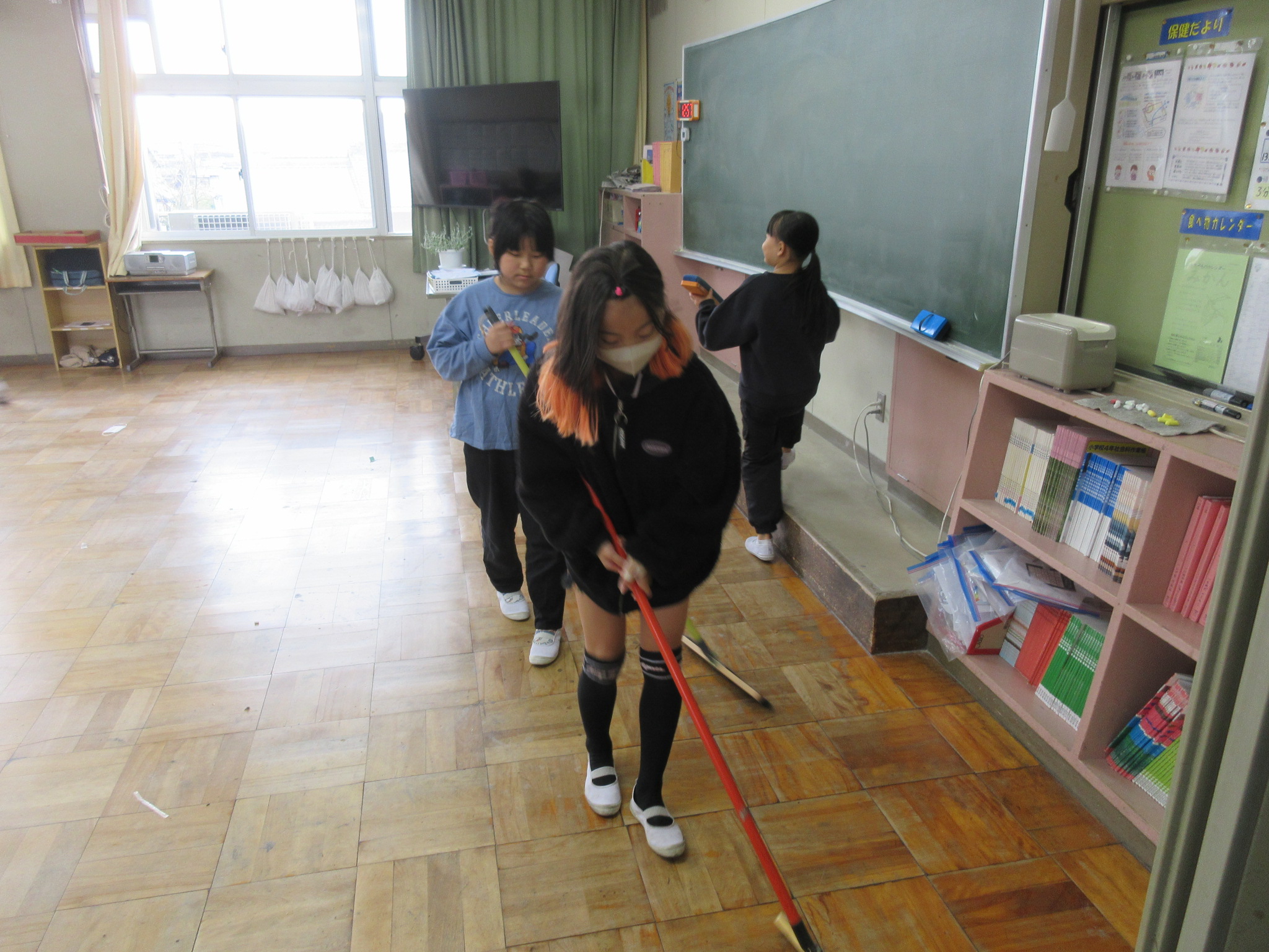 奥田小学校の掃除の時間は、「今から掃除を始めます」の挨拶で始まります。子どもたちは担当の掃除場所に分かれて、協力しながら清掃活動を行います。