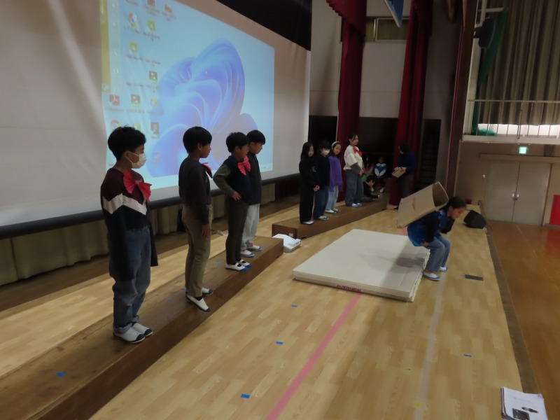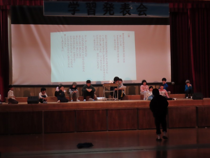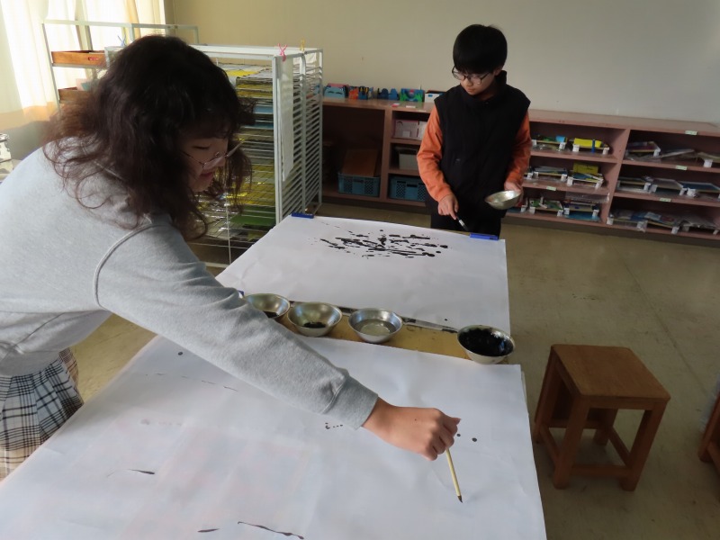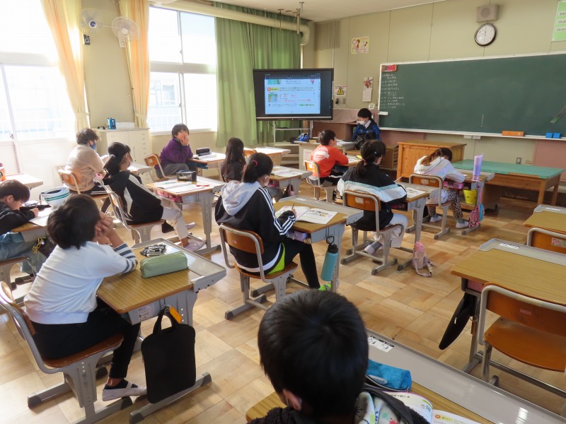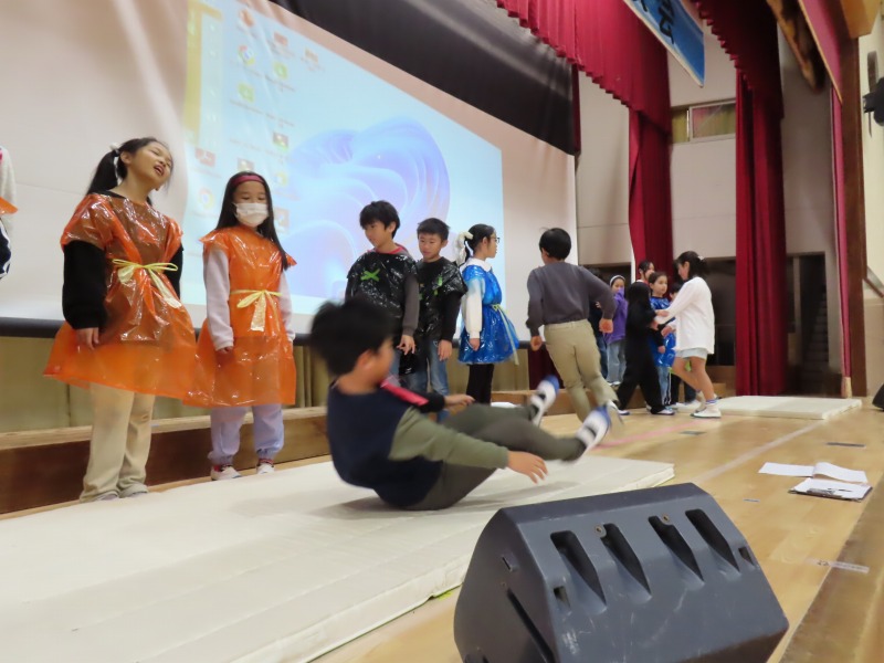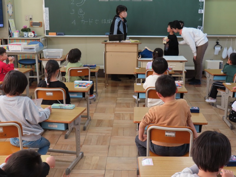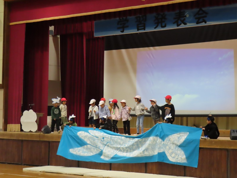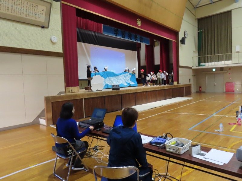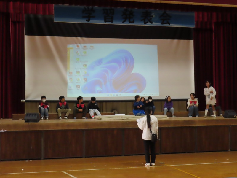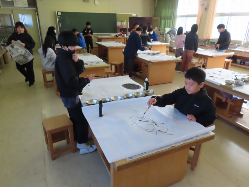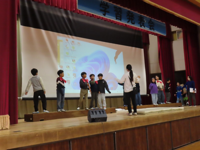学習発表会に向けての練習に熱が入ります、まだ声も小さめですが、徐々に完成に近づけてくれることでしょう。6年生は図工で大きな和紙に墨で絵をかいています。4年生は金づちやのこぎりを使って木材を使った作品に挑戦しています。1年生は外国語活動で英語で先生とお話しできました。