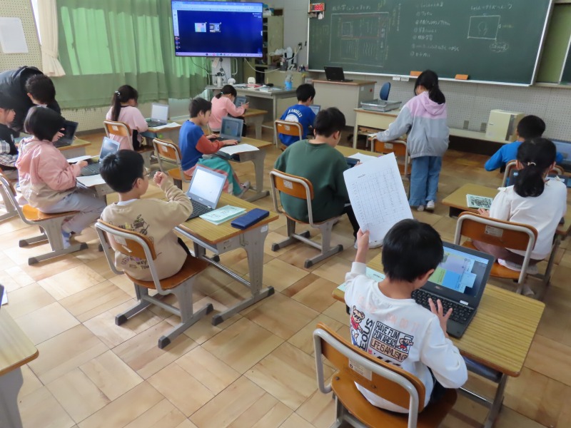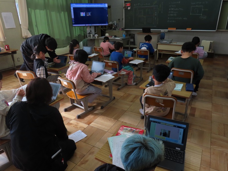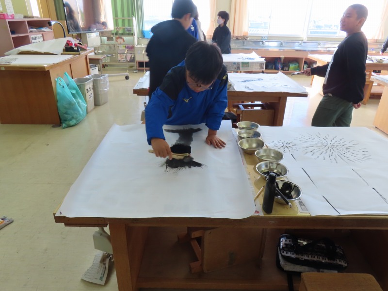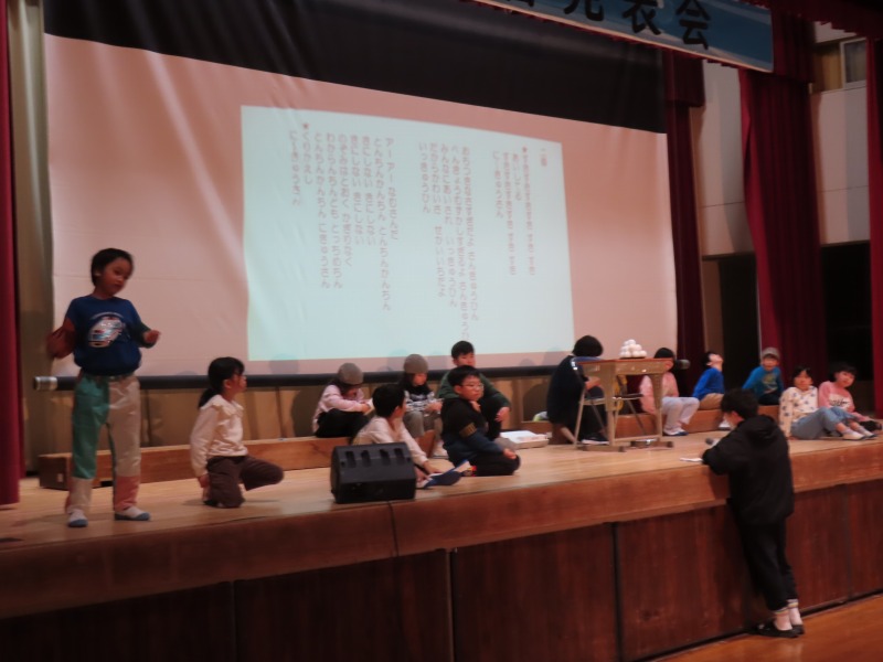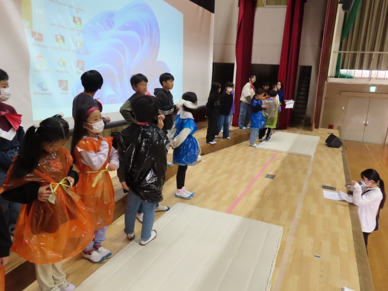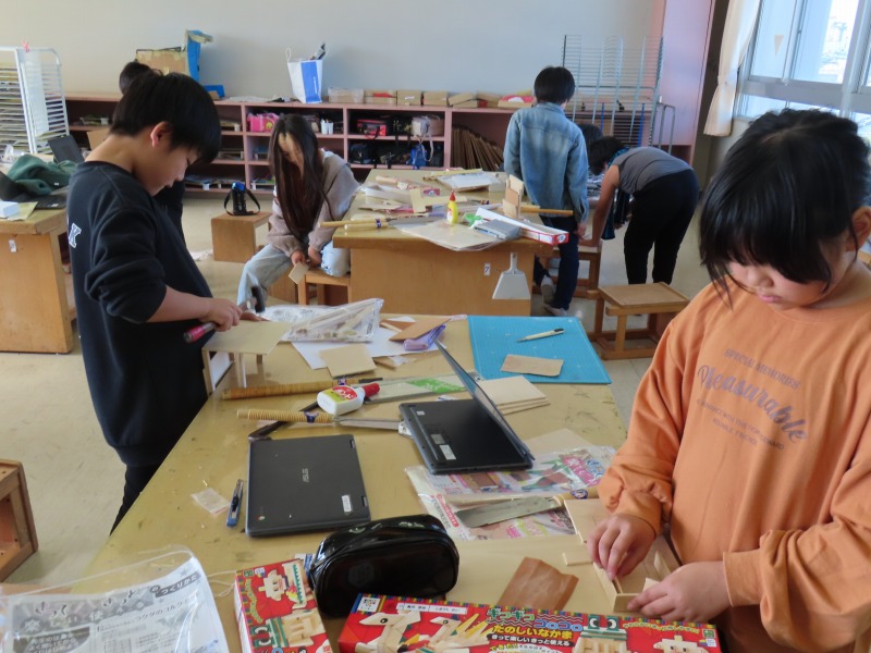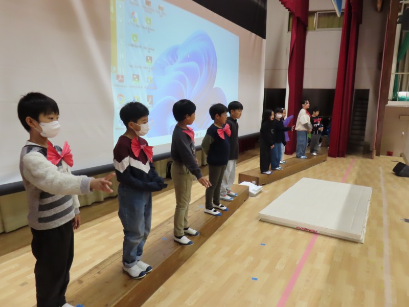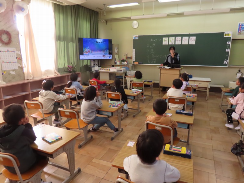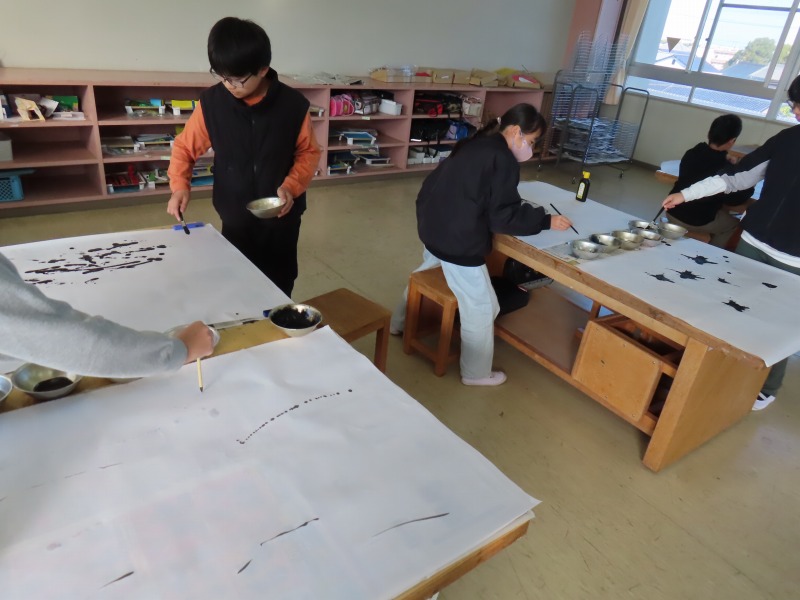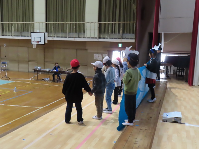 学習発表会に向けての練習に熱が入ります、まだ声も小さめですが、徐々に完成に近づけてくれることでしょう。6年生は図工で大きな和紙に墨で絵をかいています。4年生は金づちやのこぎりを使って木材を使った作品に挑戦しています。1年生は外国語活動で英語で先生とお話しできました。