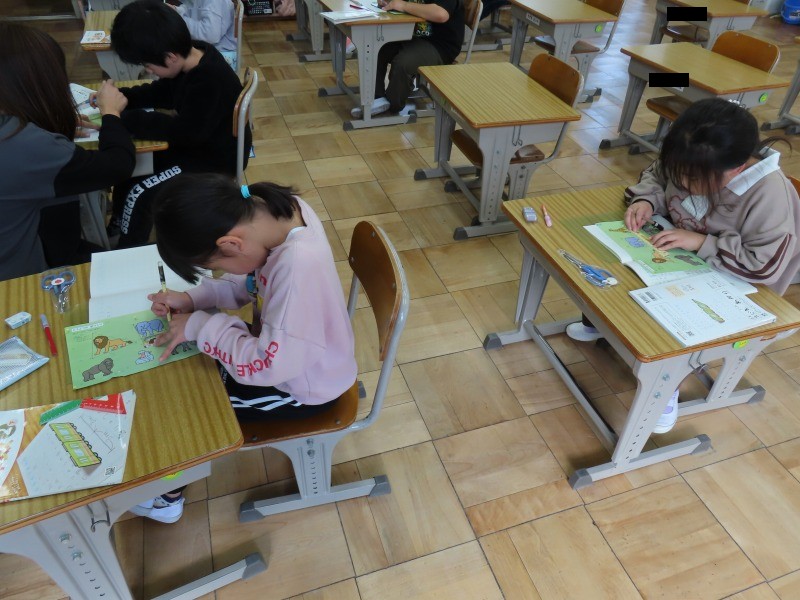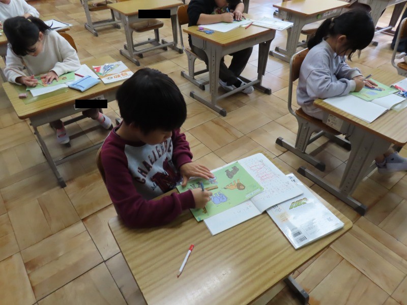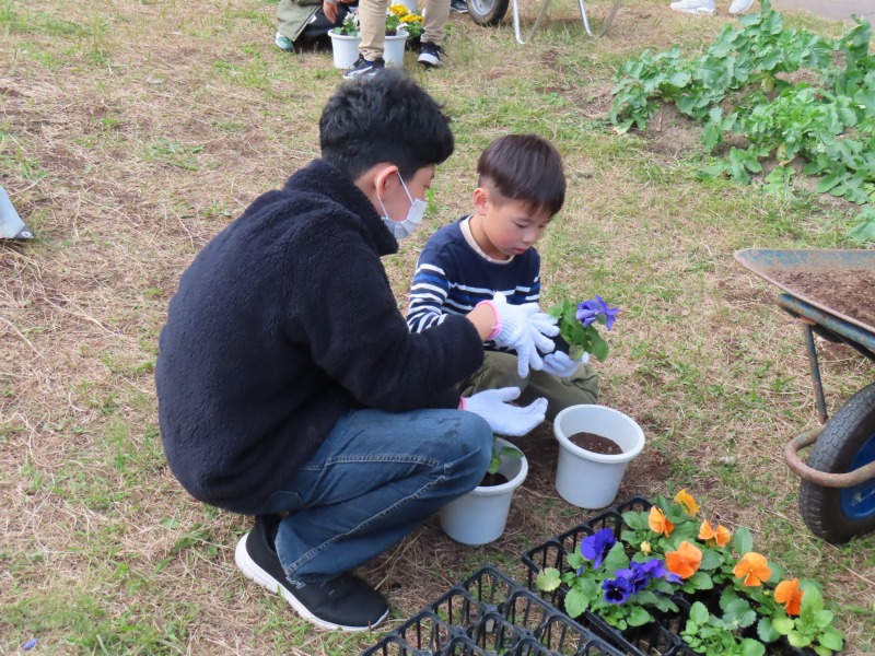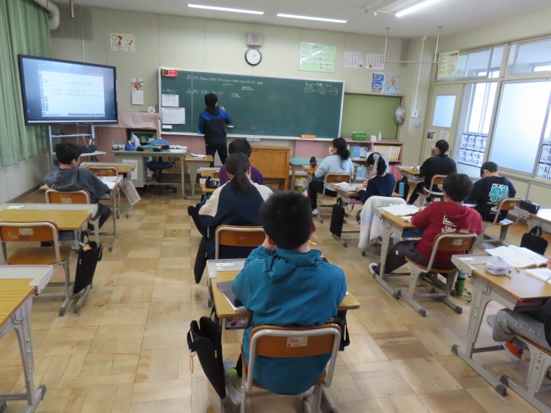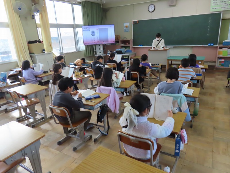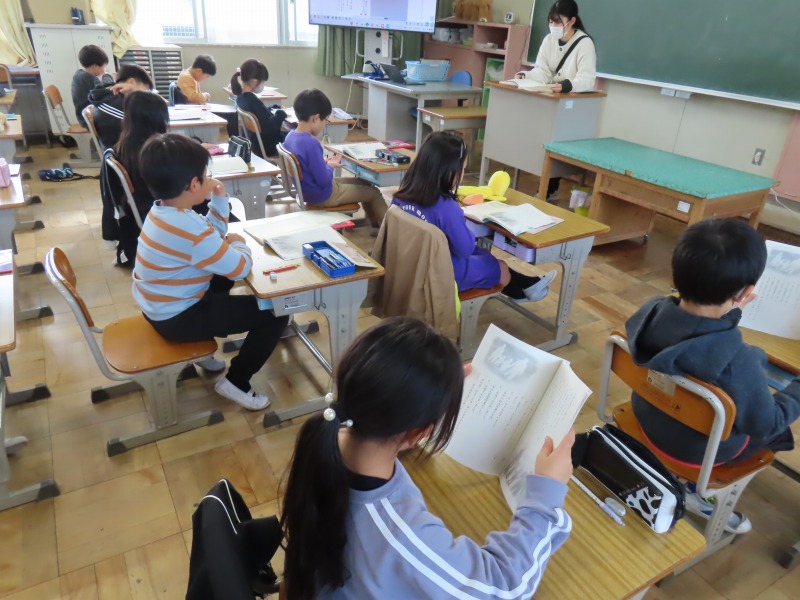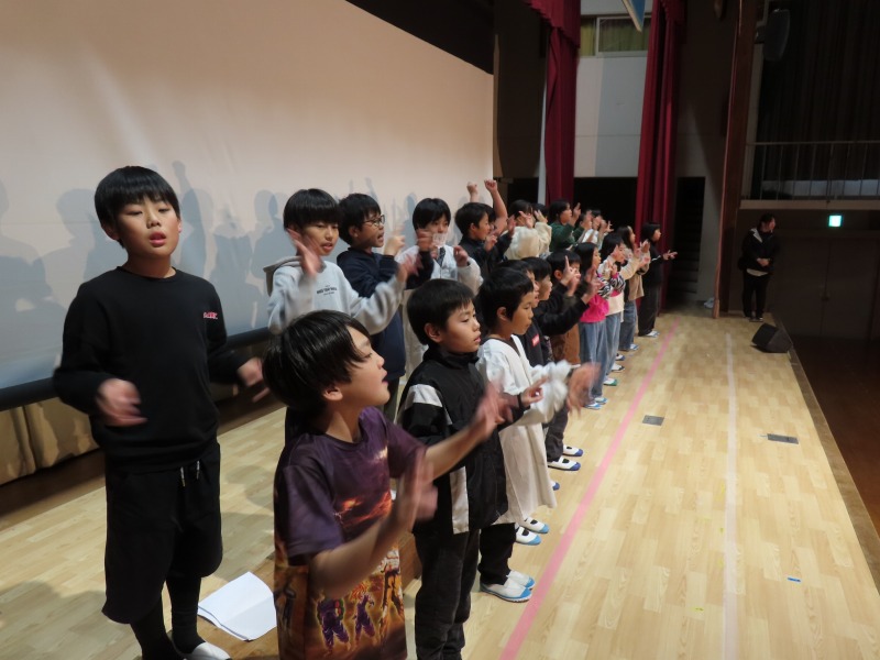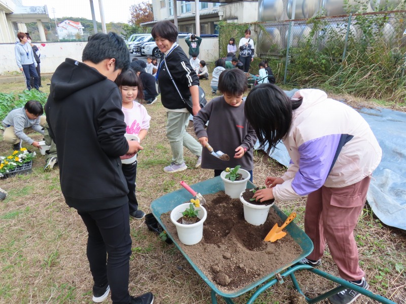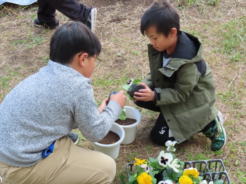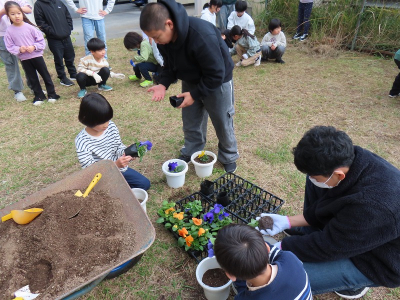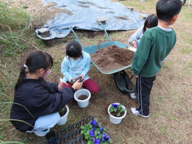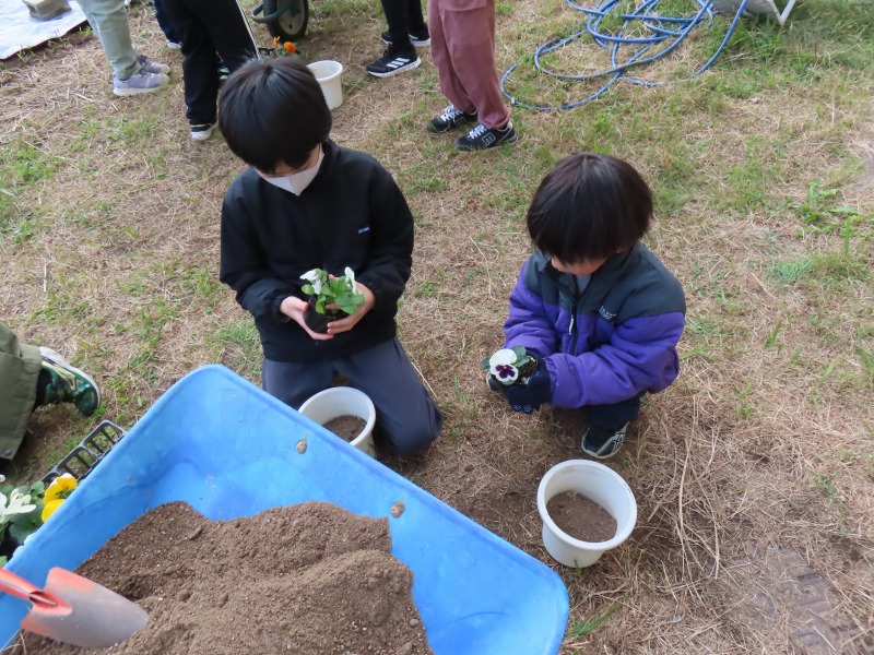授業の様子です。1年生と6年生は1人一鉢の定植をしています。6年生が丁寧にお手伝いしている姿がとても微笑ましいです。4年生は学習発表会の練習中でした。月曜日がリハーサルなので、かなり仕上がってきました。
