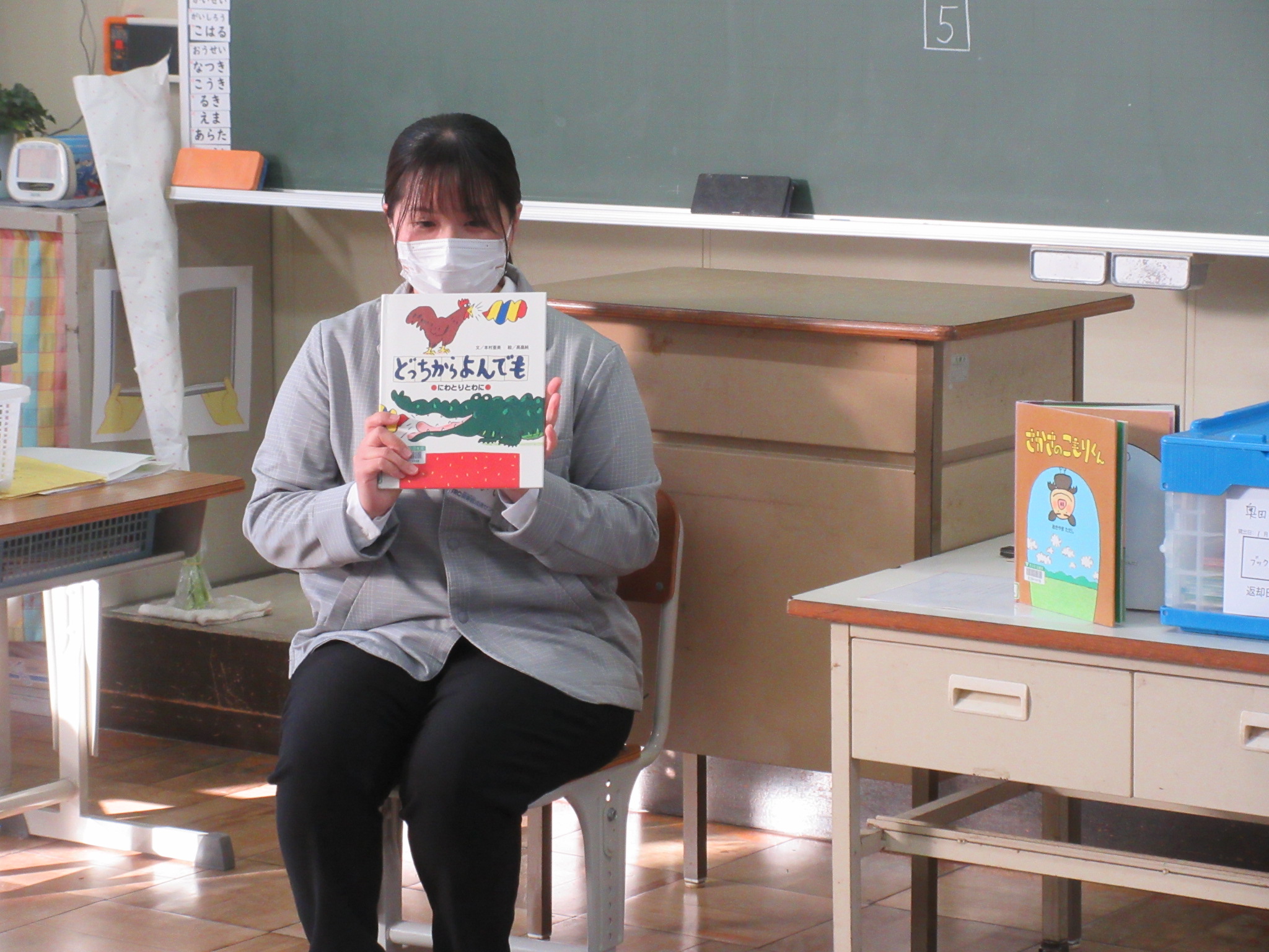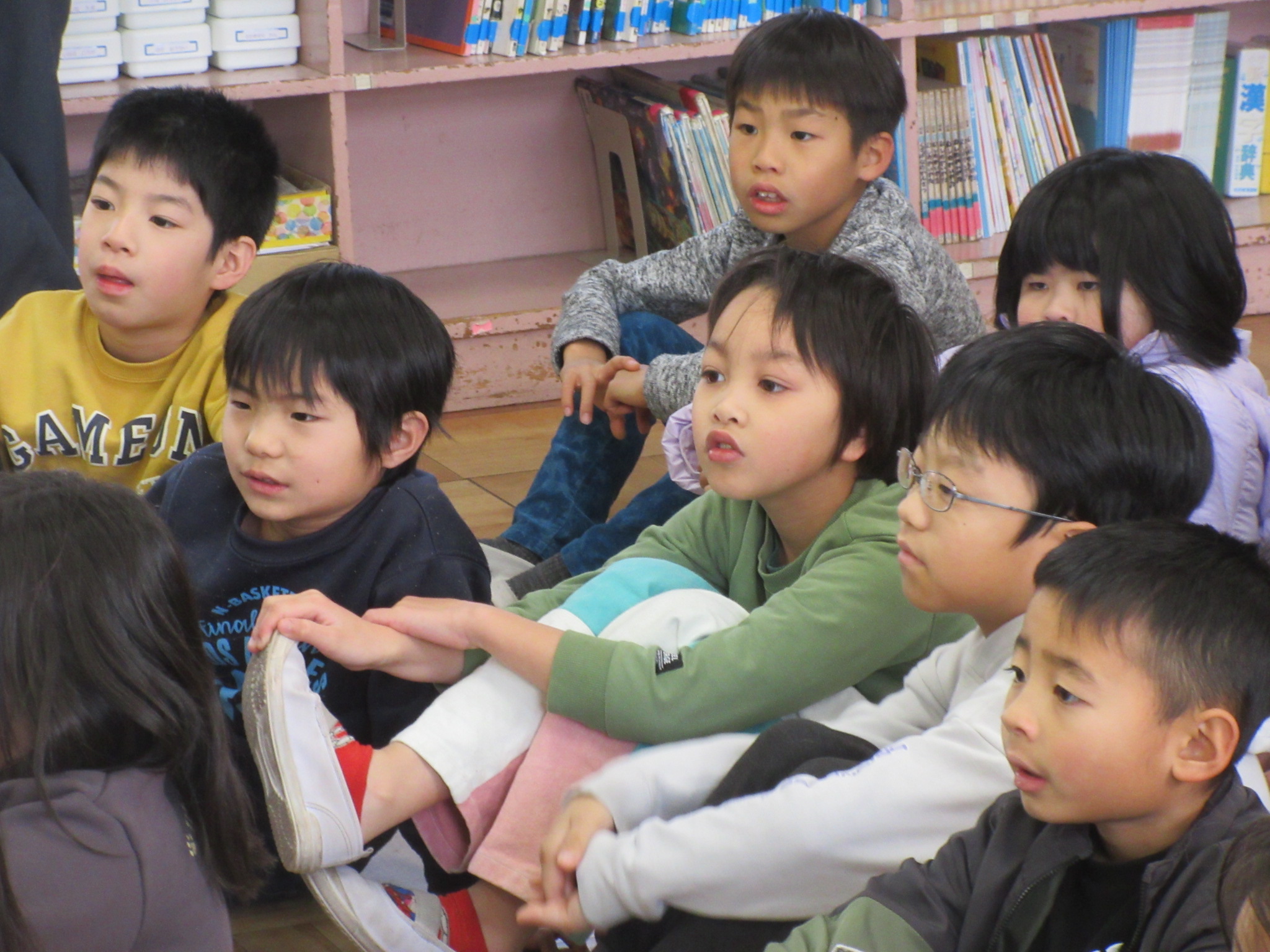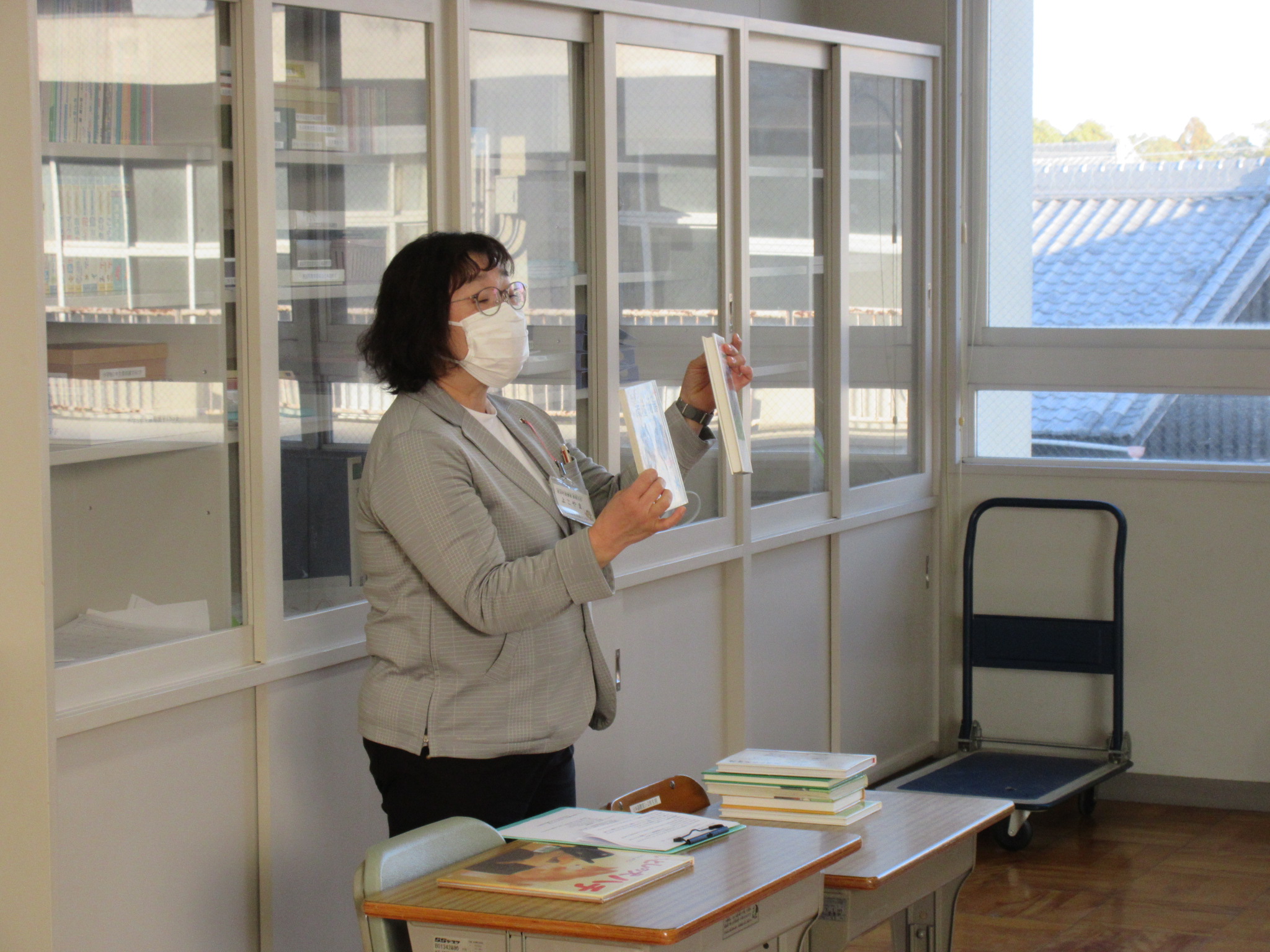 美浜町図書館の方に来ていただき、読み聞かせをしていただきました。低学年は「さかさま」をテーマにした本を、中学年は犬に関する本を、高学年は世界を変えた人に関する本を紹介していただきました。