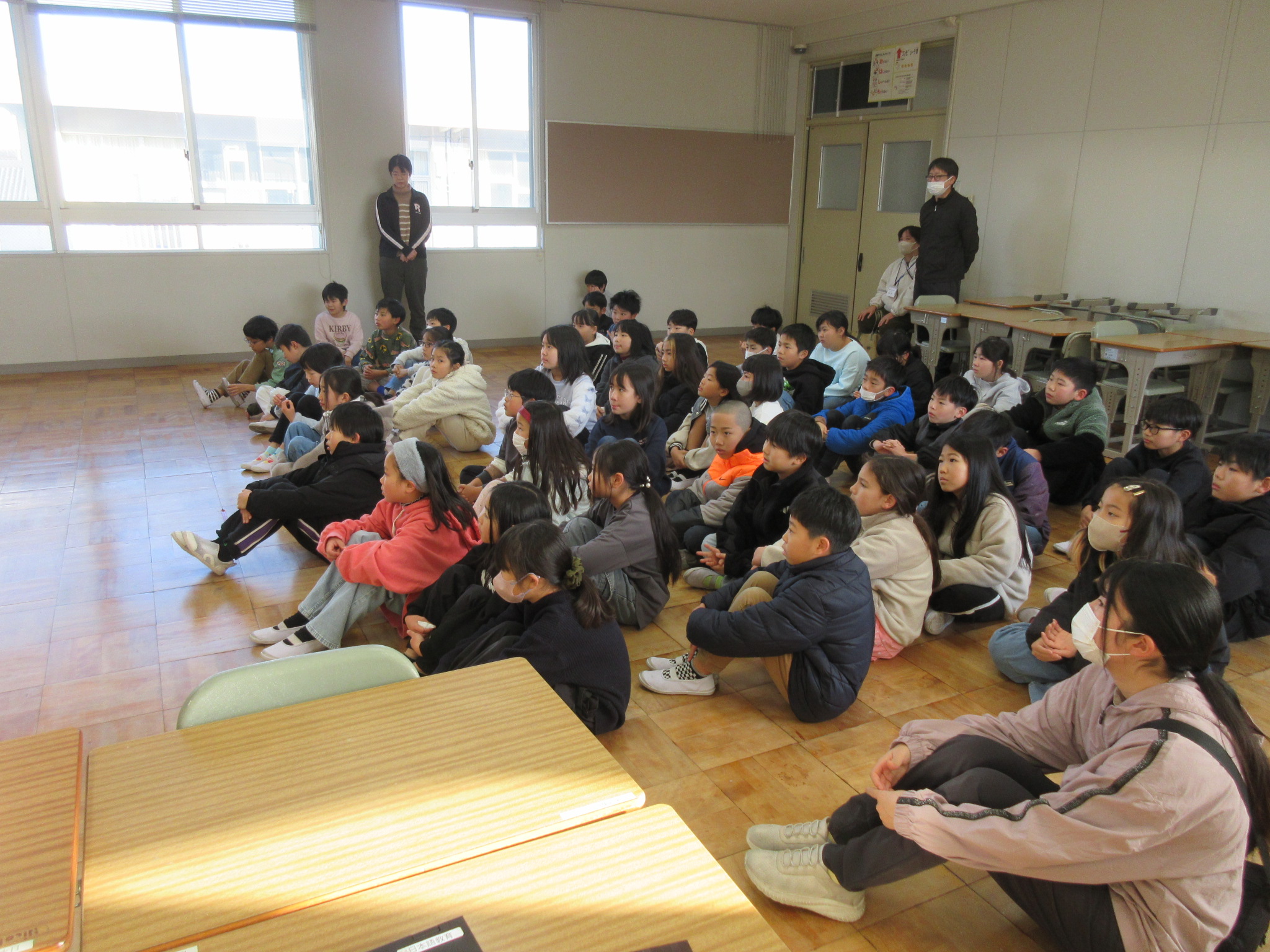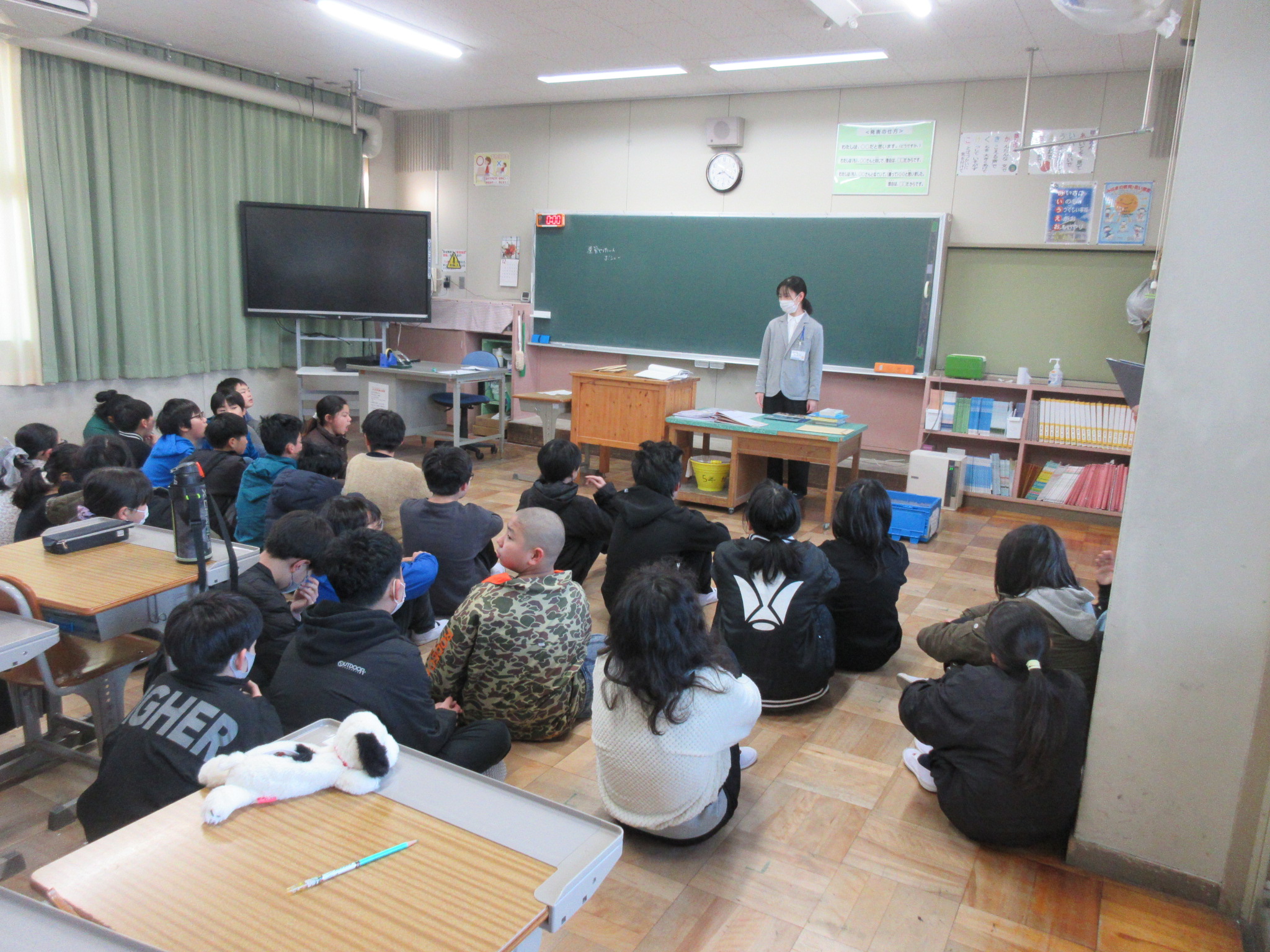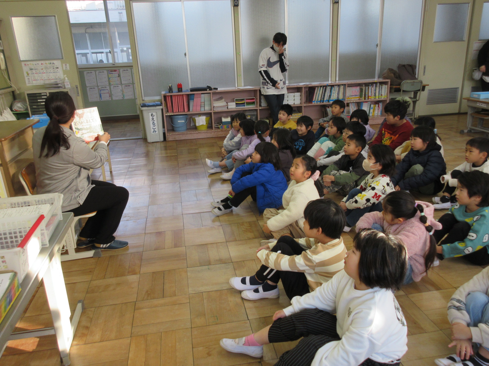 美浜町図書館の方に来ていただき、読み聞かせをしていただきました。低学年は「さかさま」をテーマにした本を、中学年は犬に関する本を、高学年は世界を変えた人に関する本を紹介していただきました。