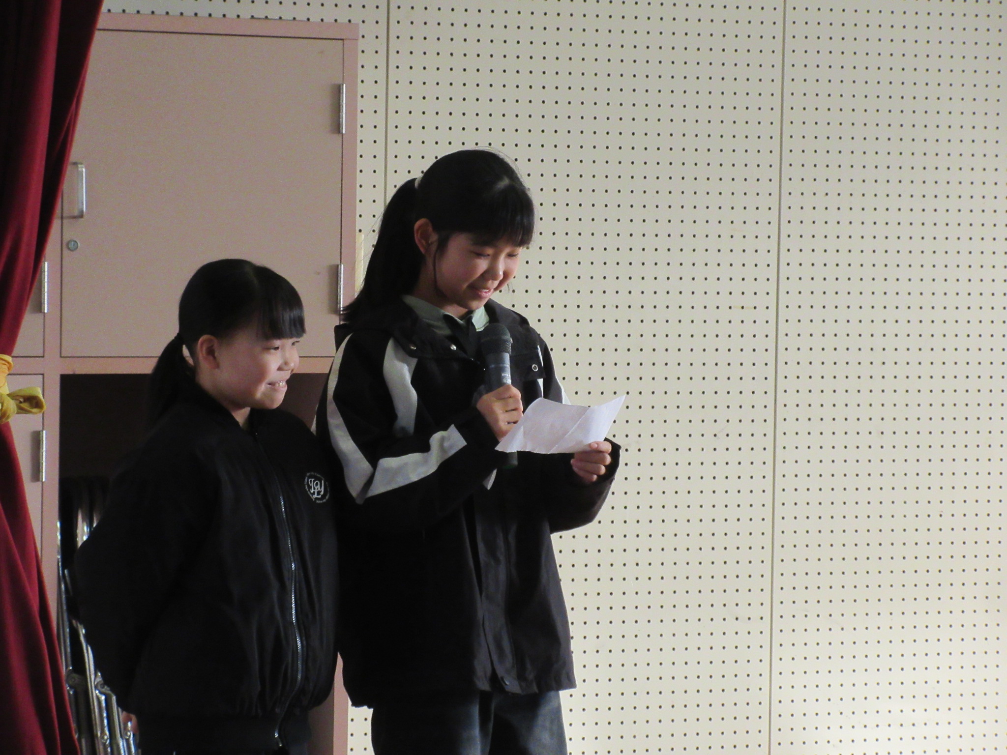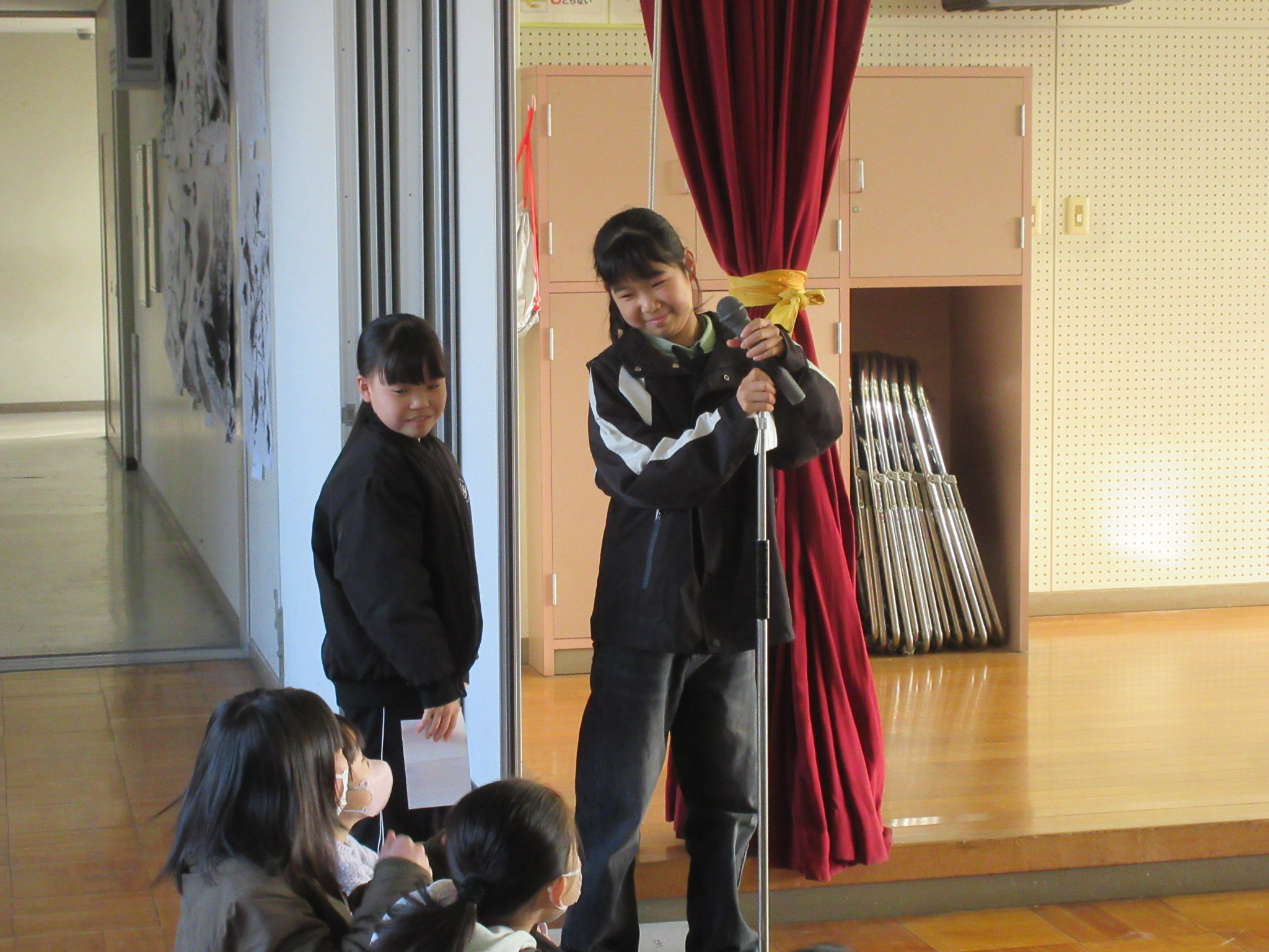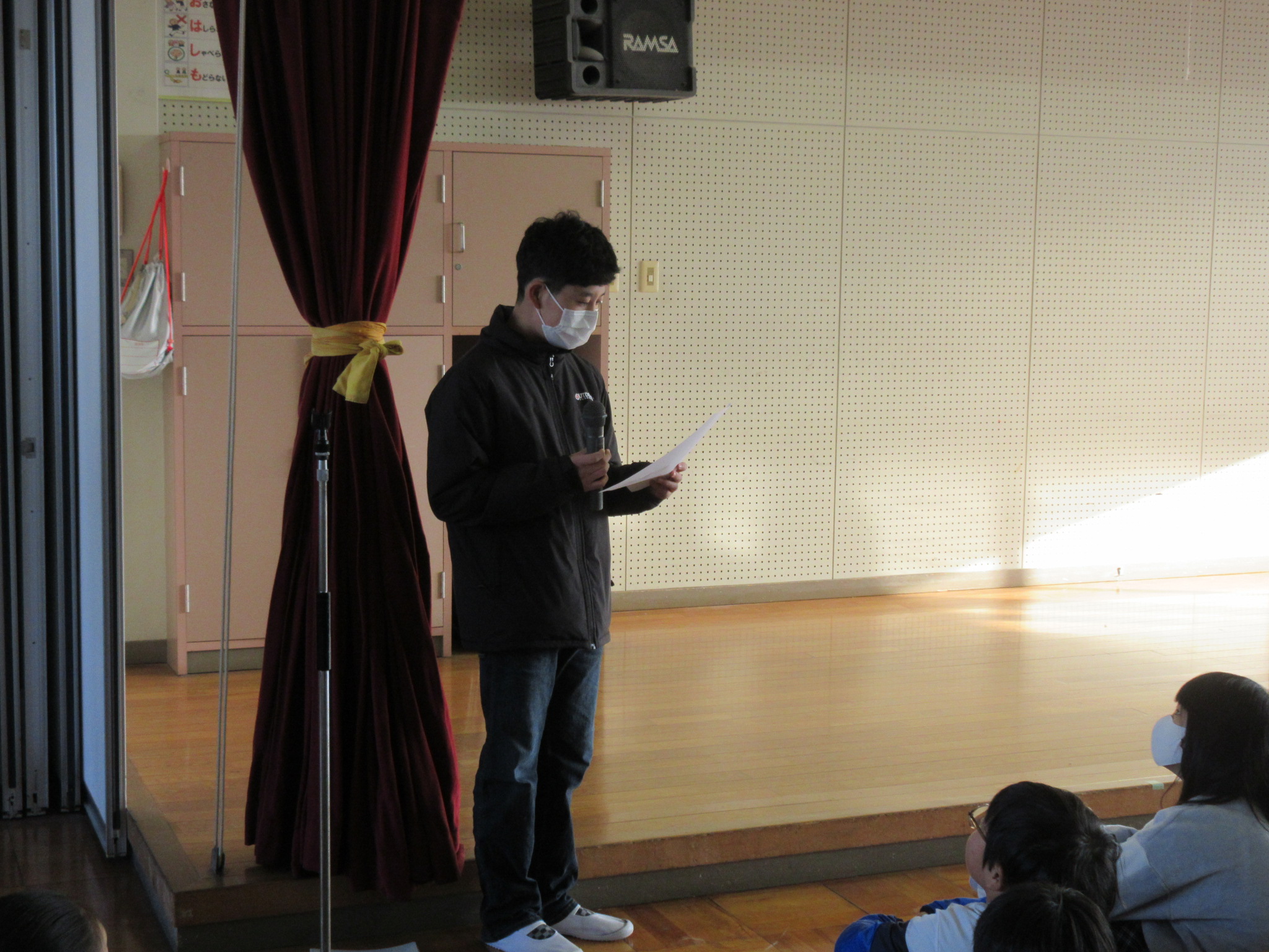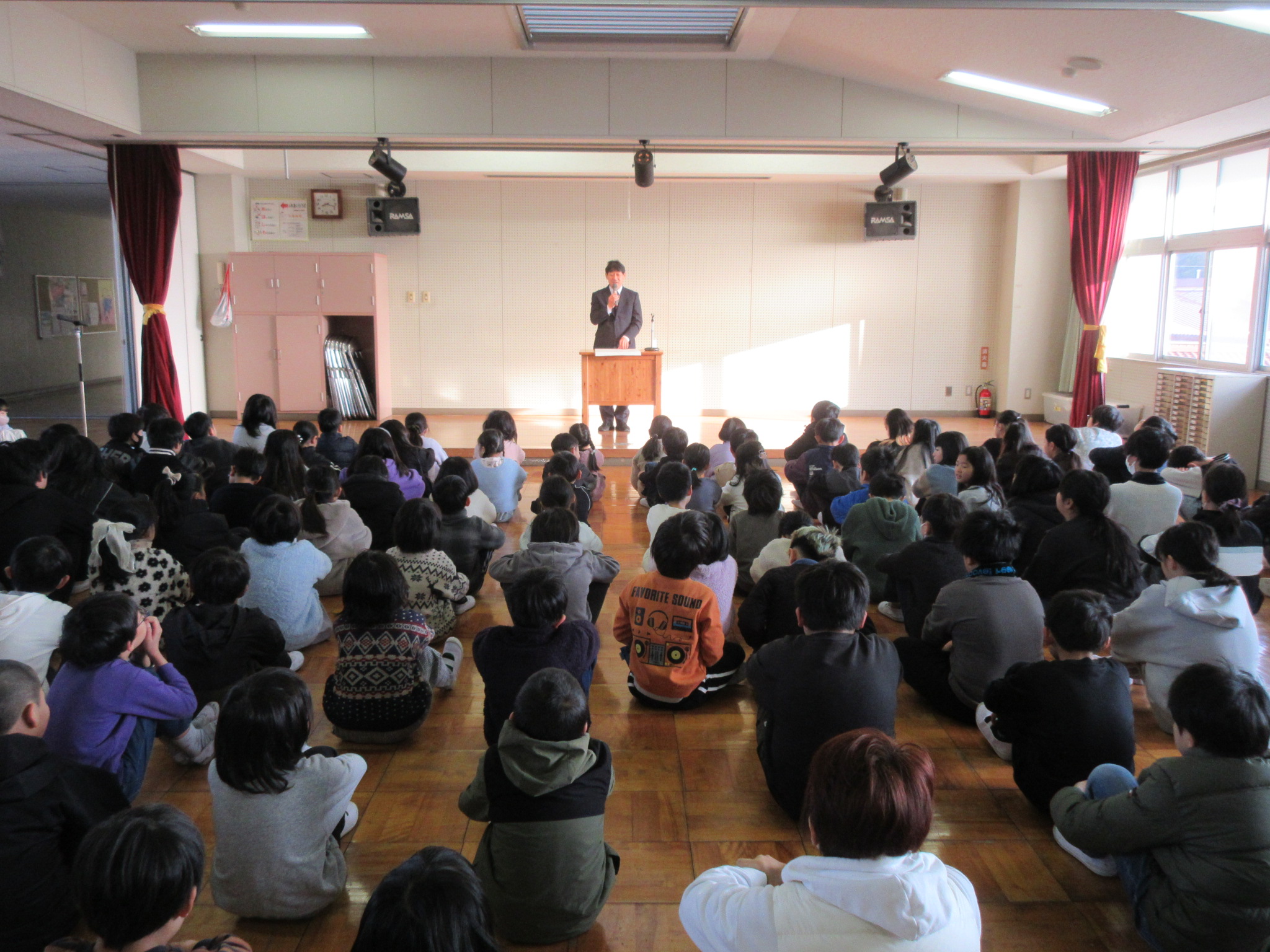 本日の朝会では、校長先生から「大寒」に関するお話、保健委員会からは、「手洗い・うがい週間」について、選挙管理委員会からは、「令和8年度前期児童会役員選挙」についての話がありました。今週は寒くなる予報です。体調管理に気をつけたいです。