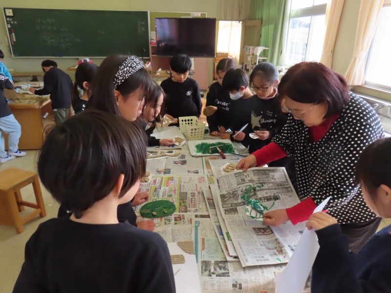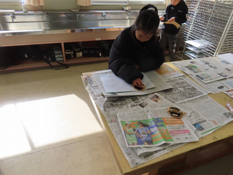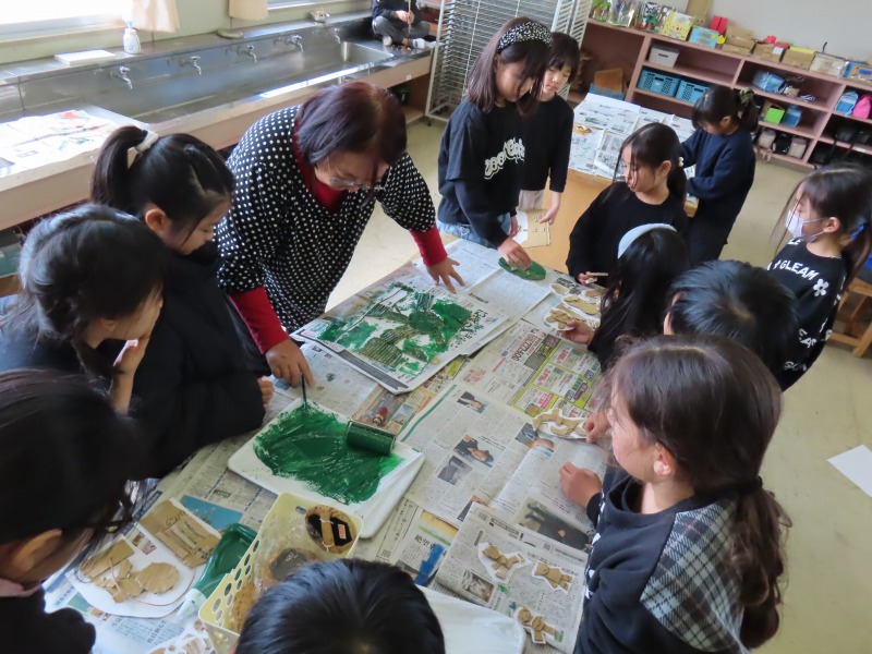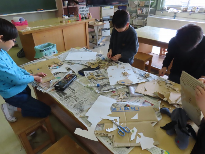 3年生の図工の様子です。段ボールを切って貼って刷り、作品を完成させます。