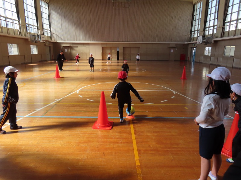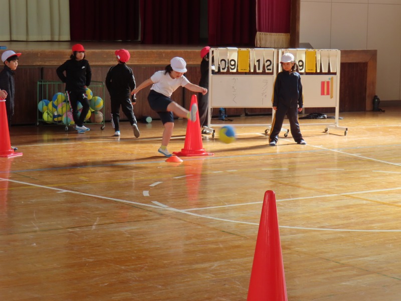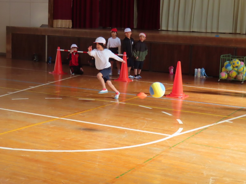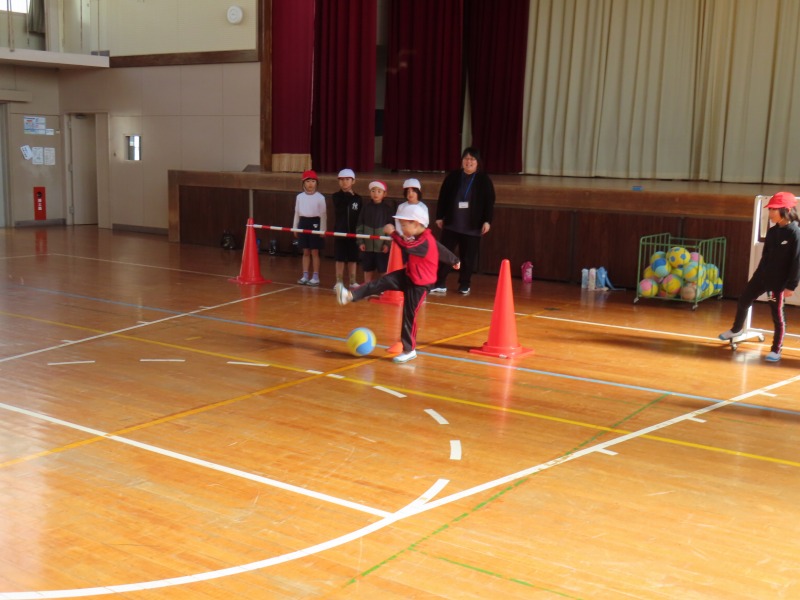 1年生はベース型球技でゲームをしています。ルールを覚え、とても楽しくプレーしていました。