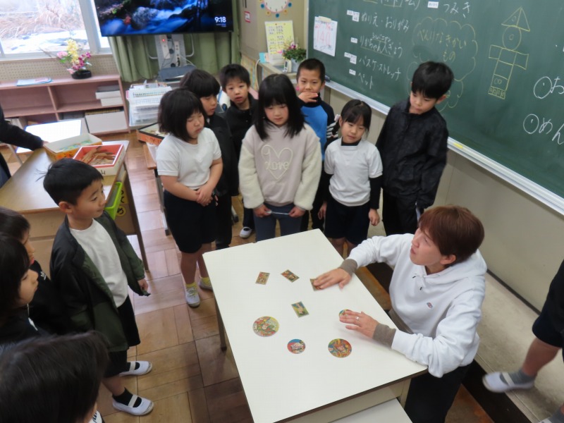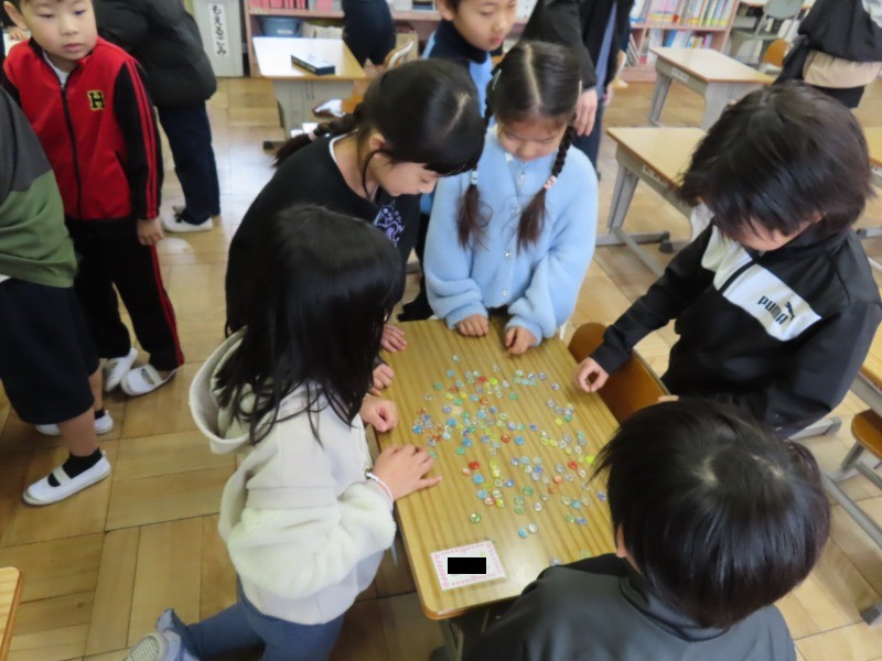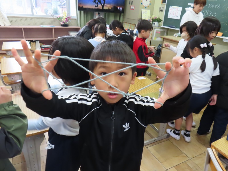 1年生の教室では昔の遊びについて体験をしていました。めんこやビー玉あやとりなど、とても楽しく遊んでいます。あやとりはみんなとても上手です。