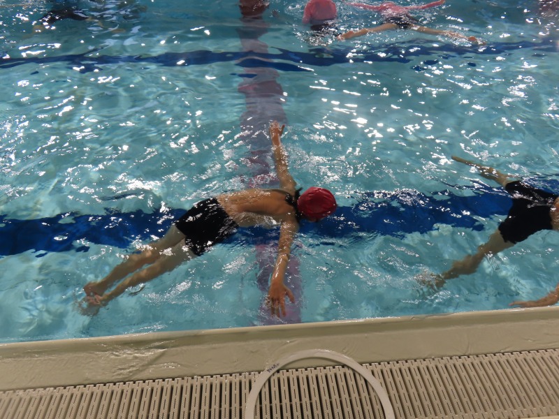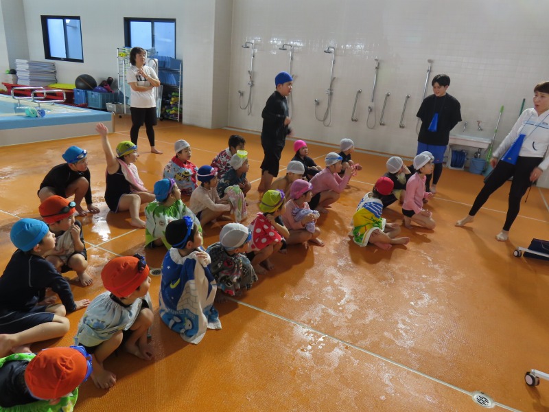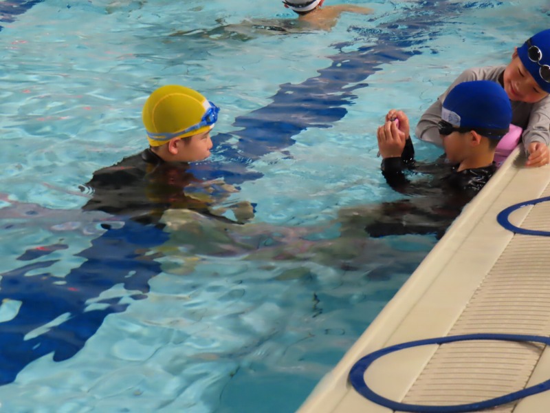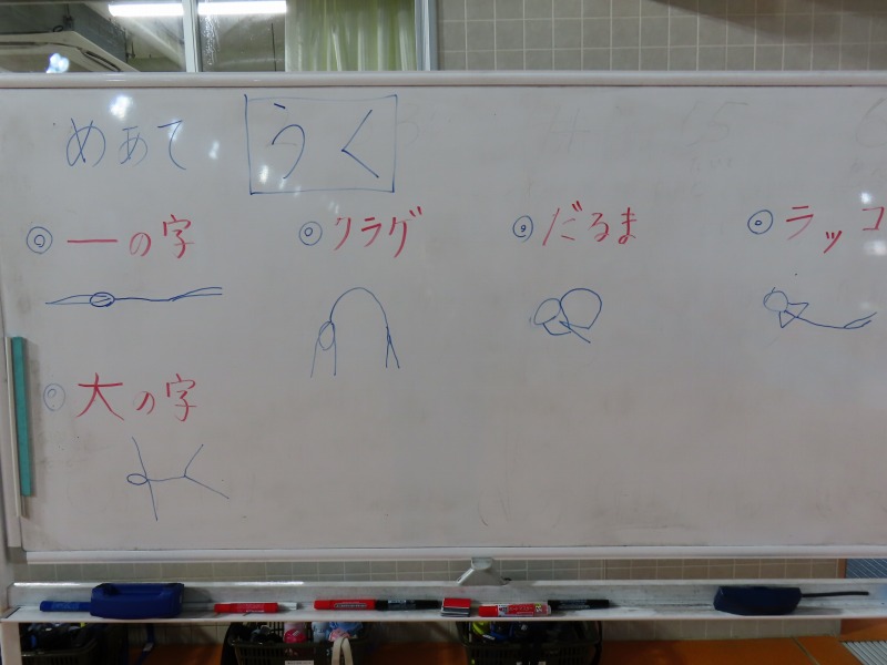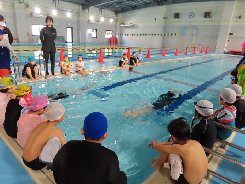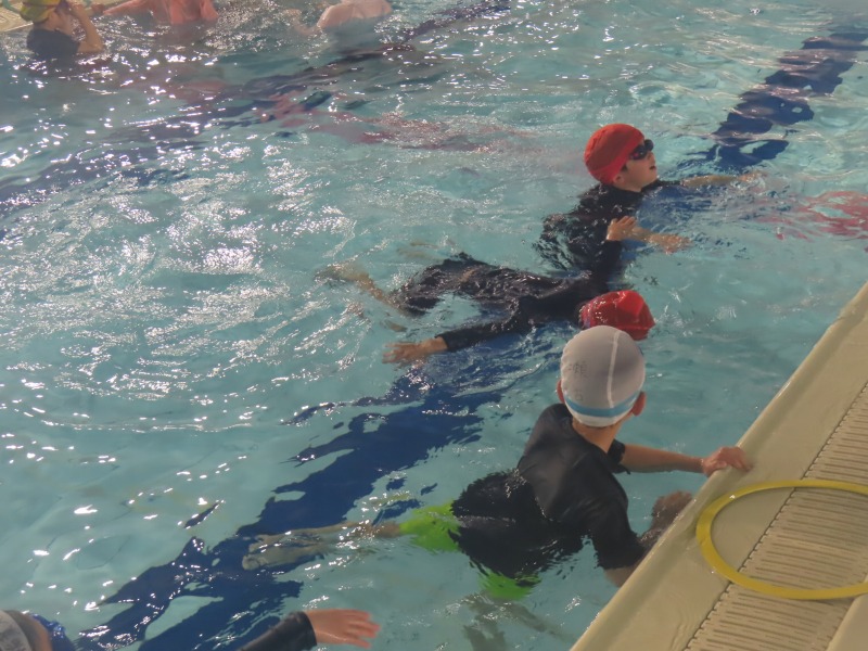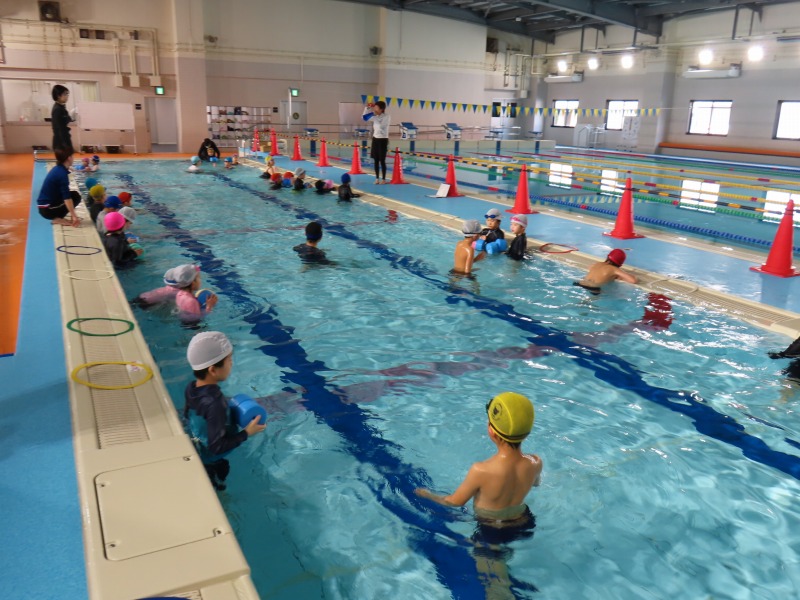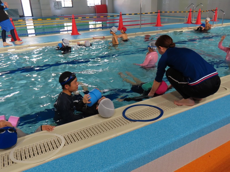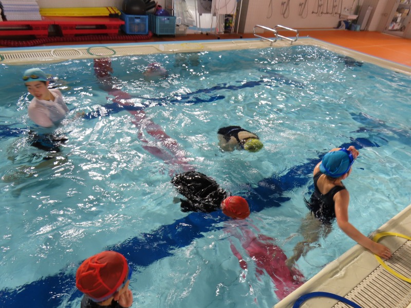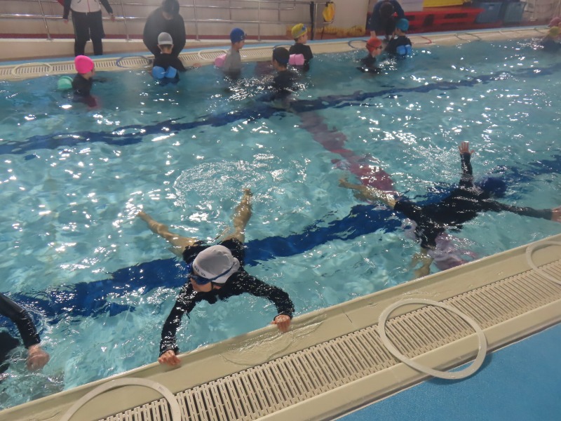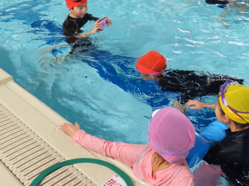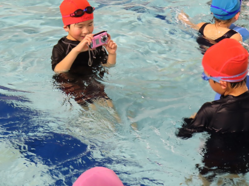 1・2年生がプールの授業です。今日の目当ては「浮く」ことです。みんなしっかり浮く練習をしています・大学生を含め10名近くの大人で見守りながら進められています。水中がカメラを使って、水の中の様子を撮影しました。