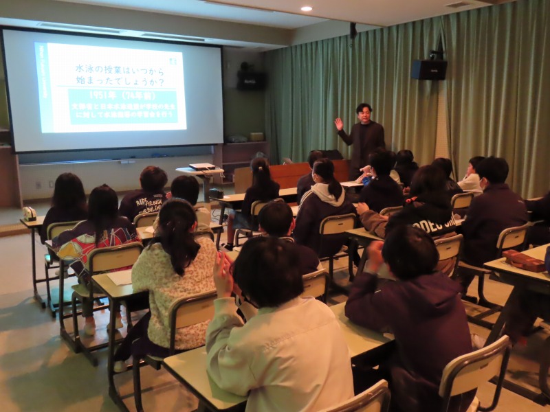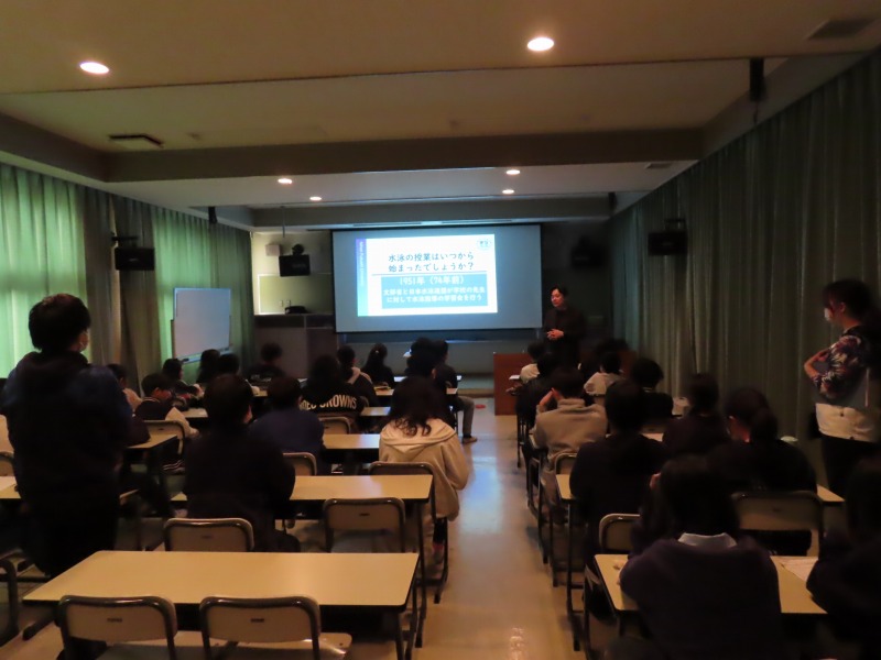 3限には日本福祉大学の先生が体育の座学をしてくれました。水泳の歴史や水に浮かぶことの必要性を教えてくれました。