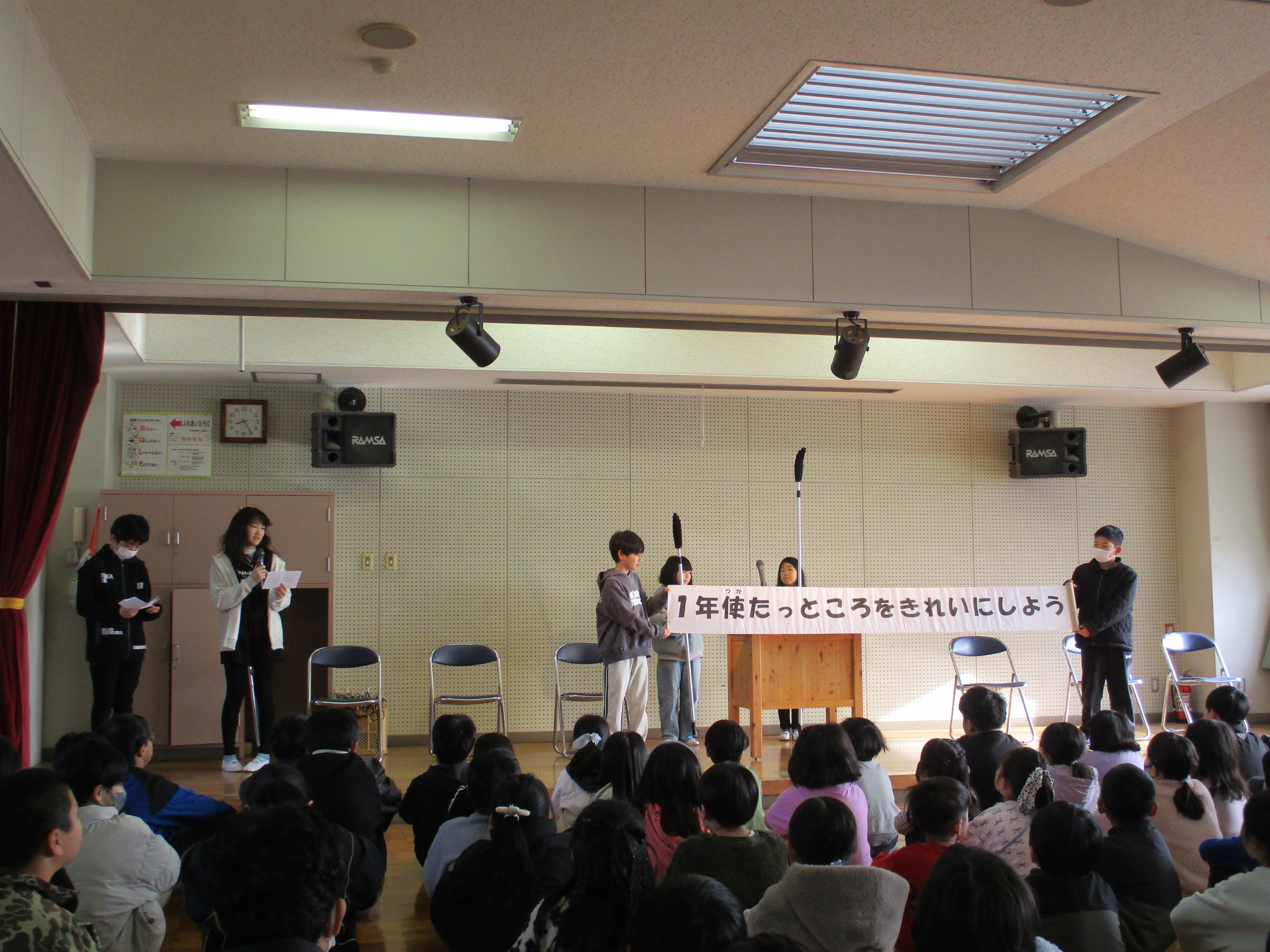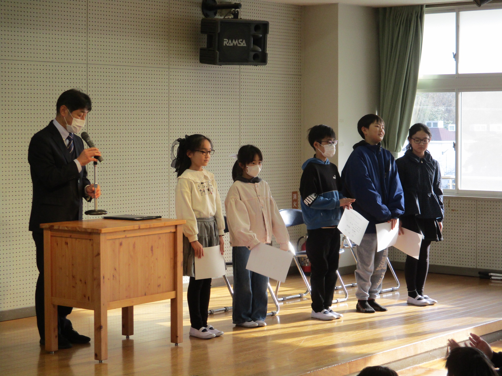 今日から三月となりました。今年度も残りわずかとなりましたが、引き続きよろしくお願いします。今日の朝会では2人の表彰のあと、来年度前期児童会役員の任命式が行われ、先日の選挙で当選した5名に任命状が渡されました。また、環境委員会からはキャンペーン活動の紹介がありました。