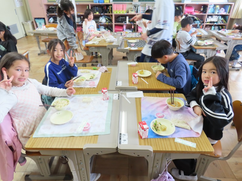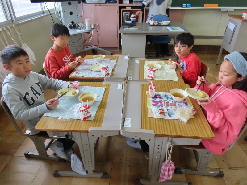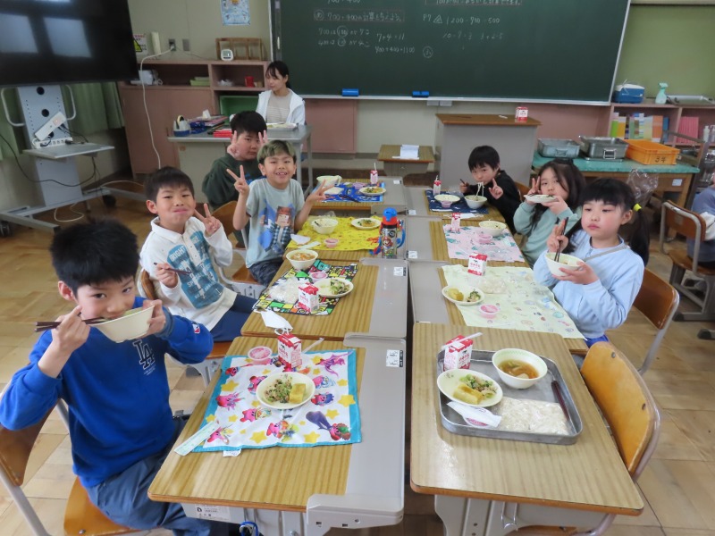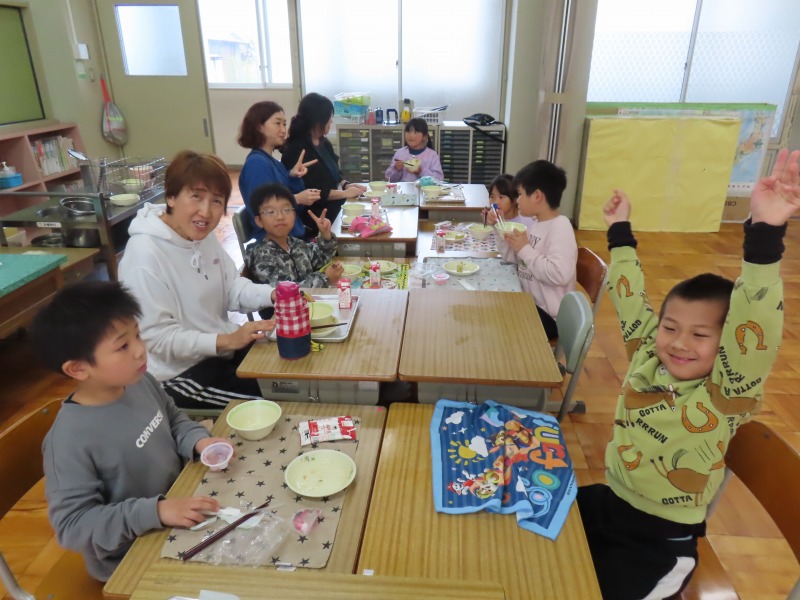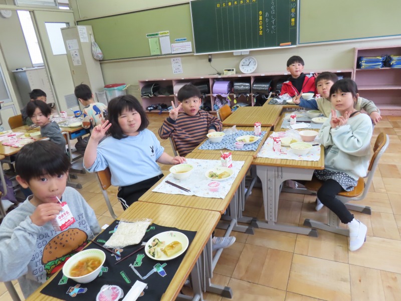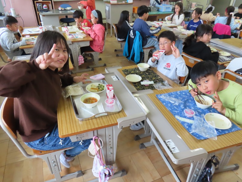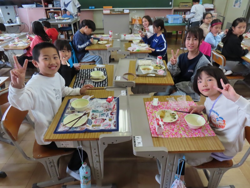 2年生から6年生は今年度初の給食です。みんなおいしそうに食べていました。