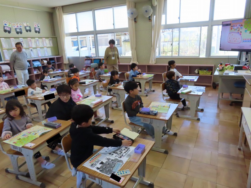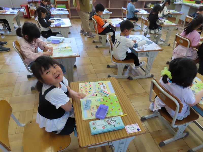 授業の様子です。1年生は算数の授業でした。色つきのブロックをつかって数を数える学習です。また、今日から給食が始まります。3限には配膳室を見学したり、配膳の仕方を学んだりしました。