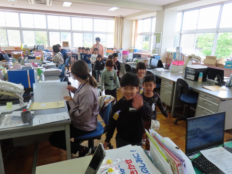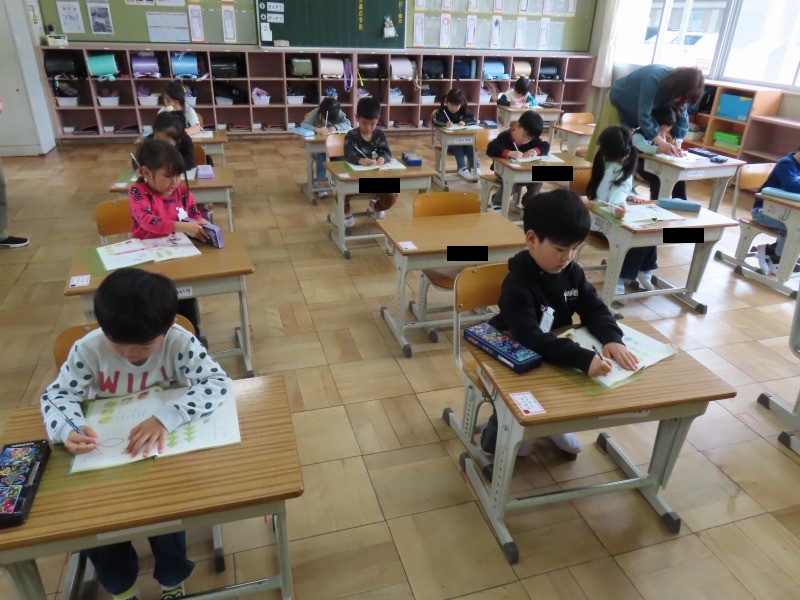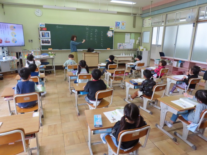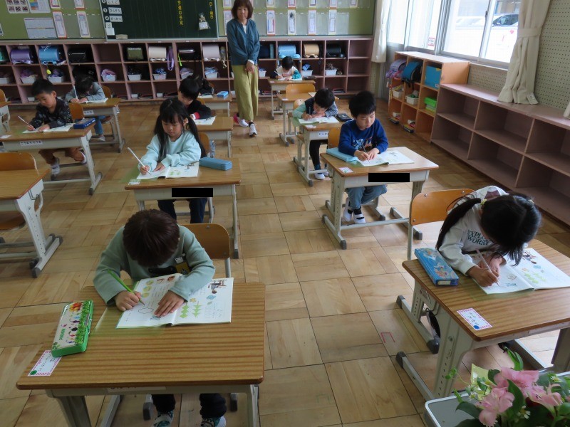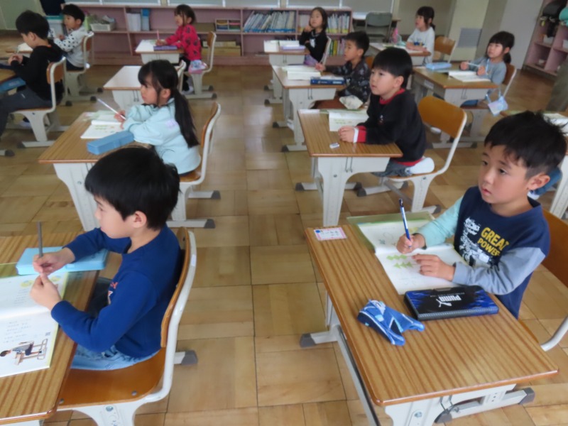 1年生の教室です。今日は鉛筆の持ち方を学びました。教科書やモニターを見て正しい持ち方を確認して練習をします。みんなただし持ち方を理解してしっかり練習できていました。そのあと、学校を少し回りました。