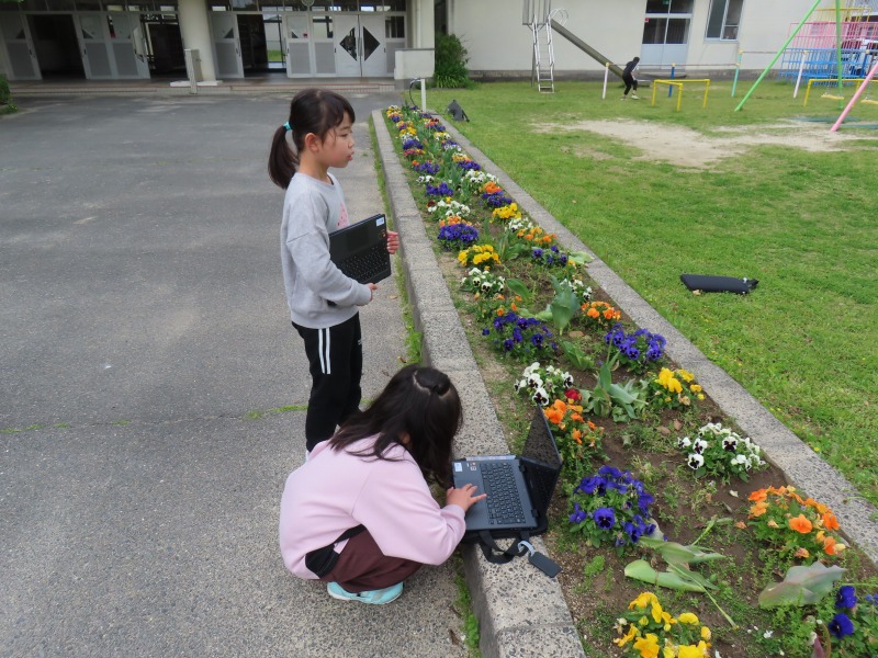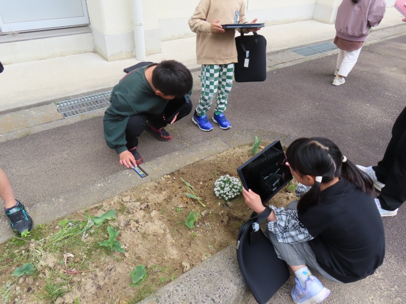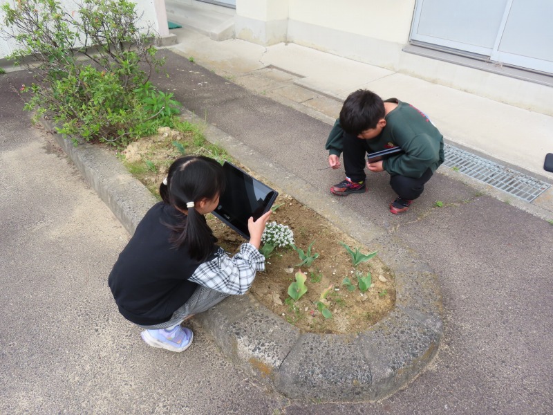 3年生は理科で、外に出てタブレットを使って春の生き物や植物を探し、写真を撮っています。