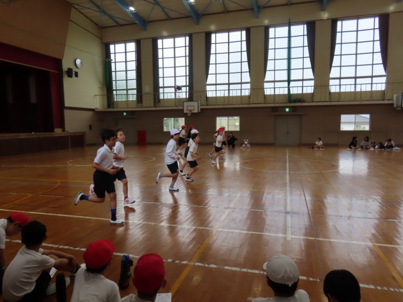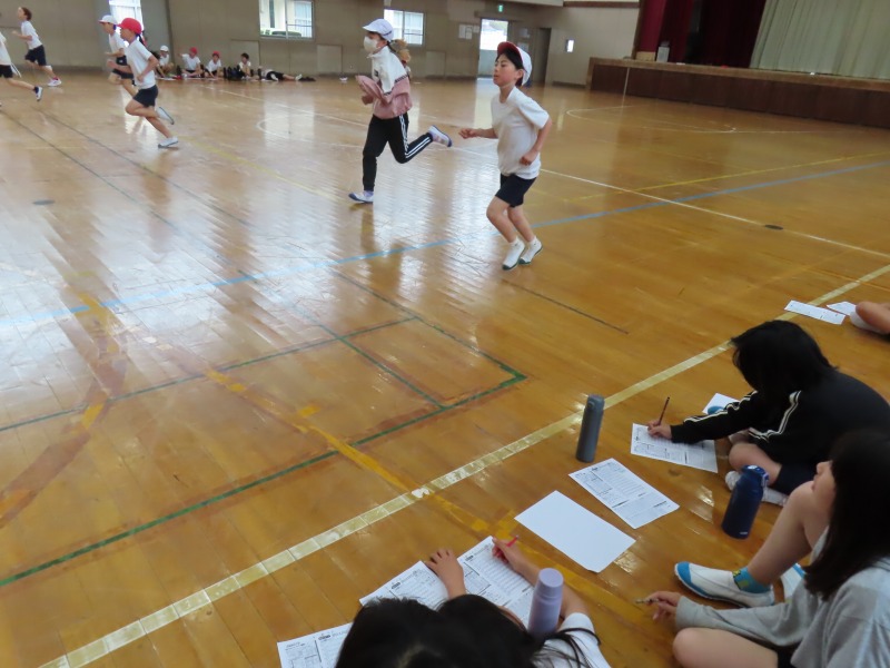 5年生は体育の様子です。体力テストの持久力を計測するシャトルランに挑戦していました。みんな、体力の限界までがんばっていました。
