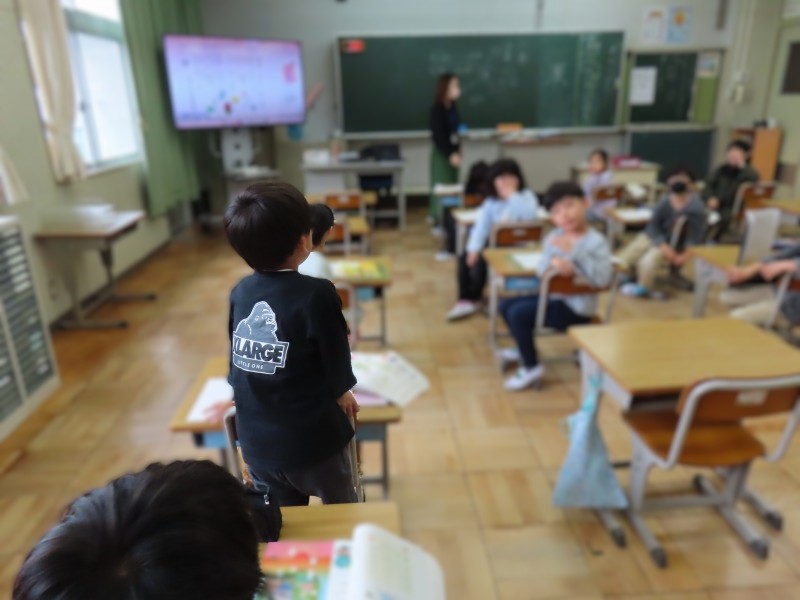 3年生の国語の様子です。「春」から思いつくものを発表しています。発表者の意見に耳を傾けているところがいいですね。