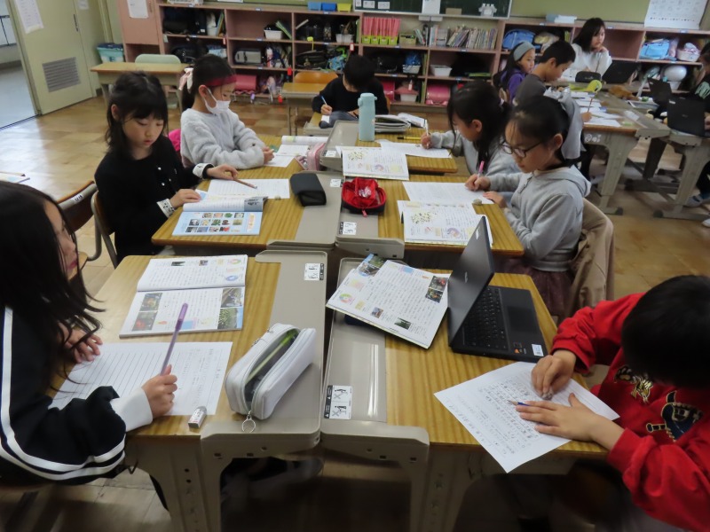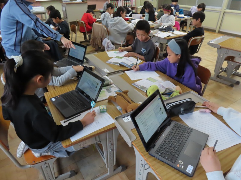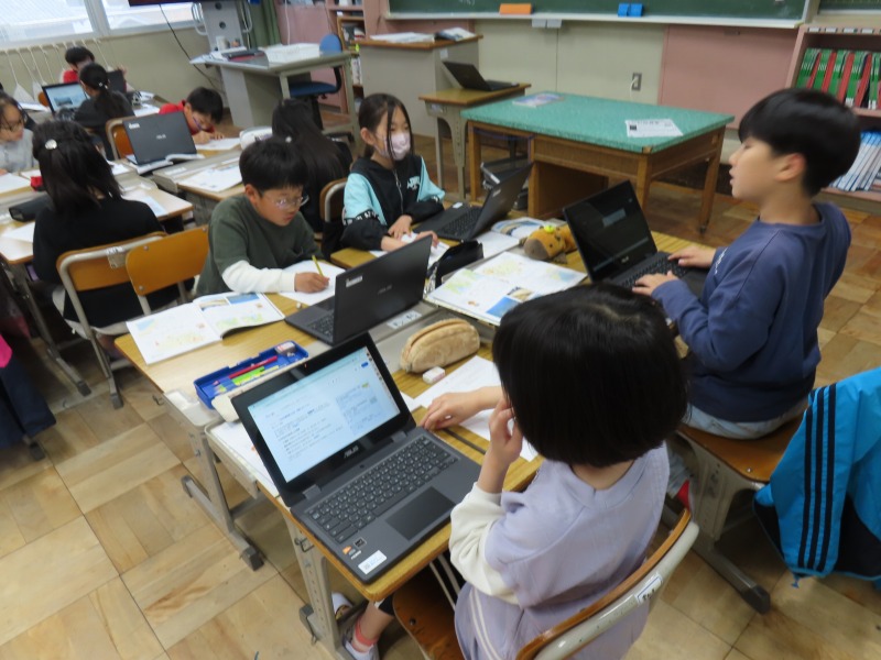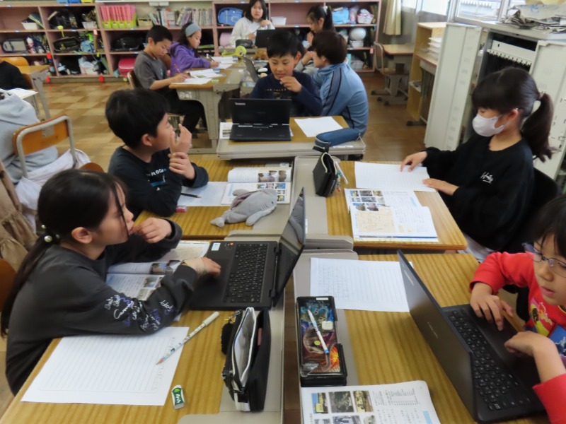 4年生は社会で、愛知について調べています。インターネットをつかってグループで取り組んでいました。