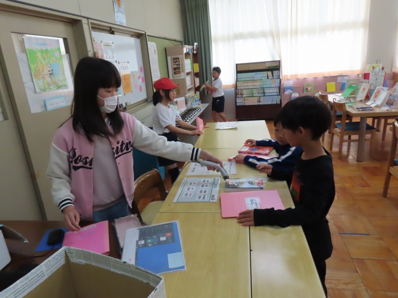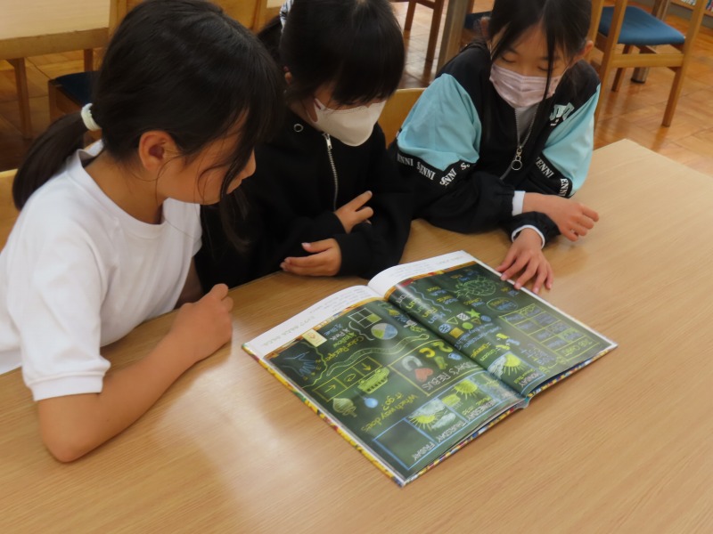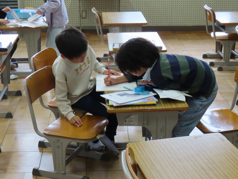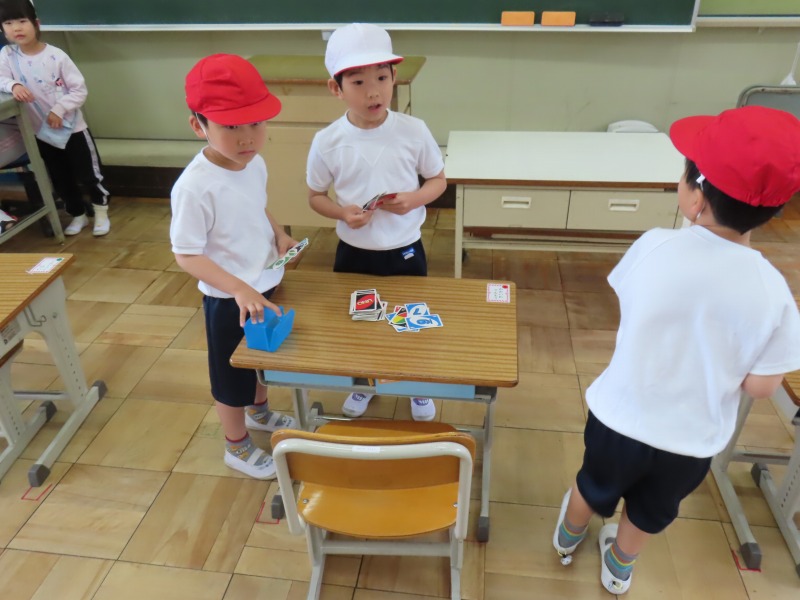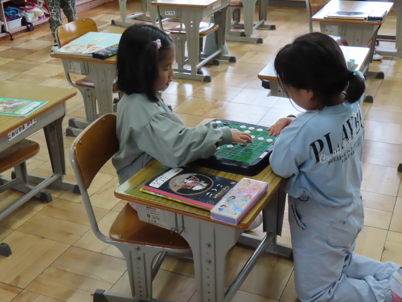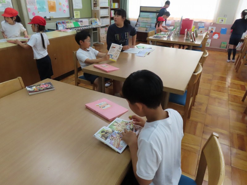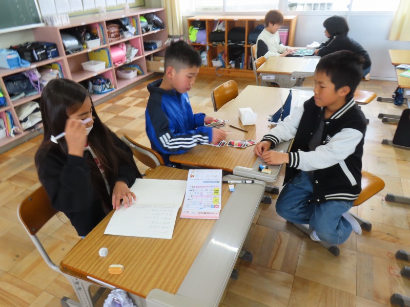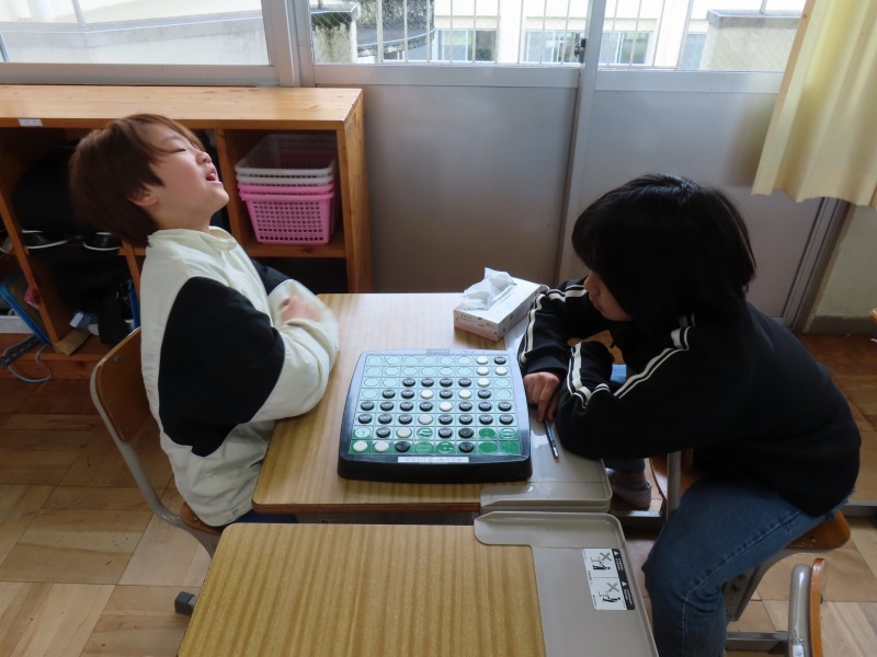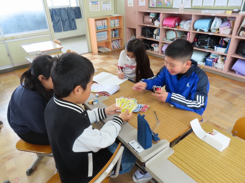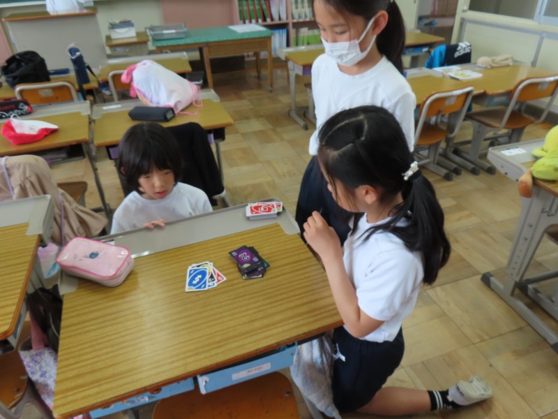 今日は昨日の雨で運動場が使えません。そのため、大放課は室内で過ごしています。図書館で本を読んだり、教室でカードゲームをしたり、さまざまな活動をしながら楽しんでいます。